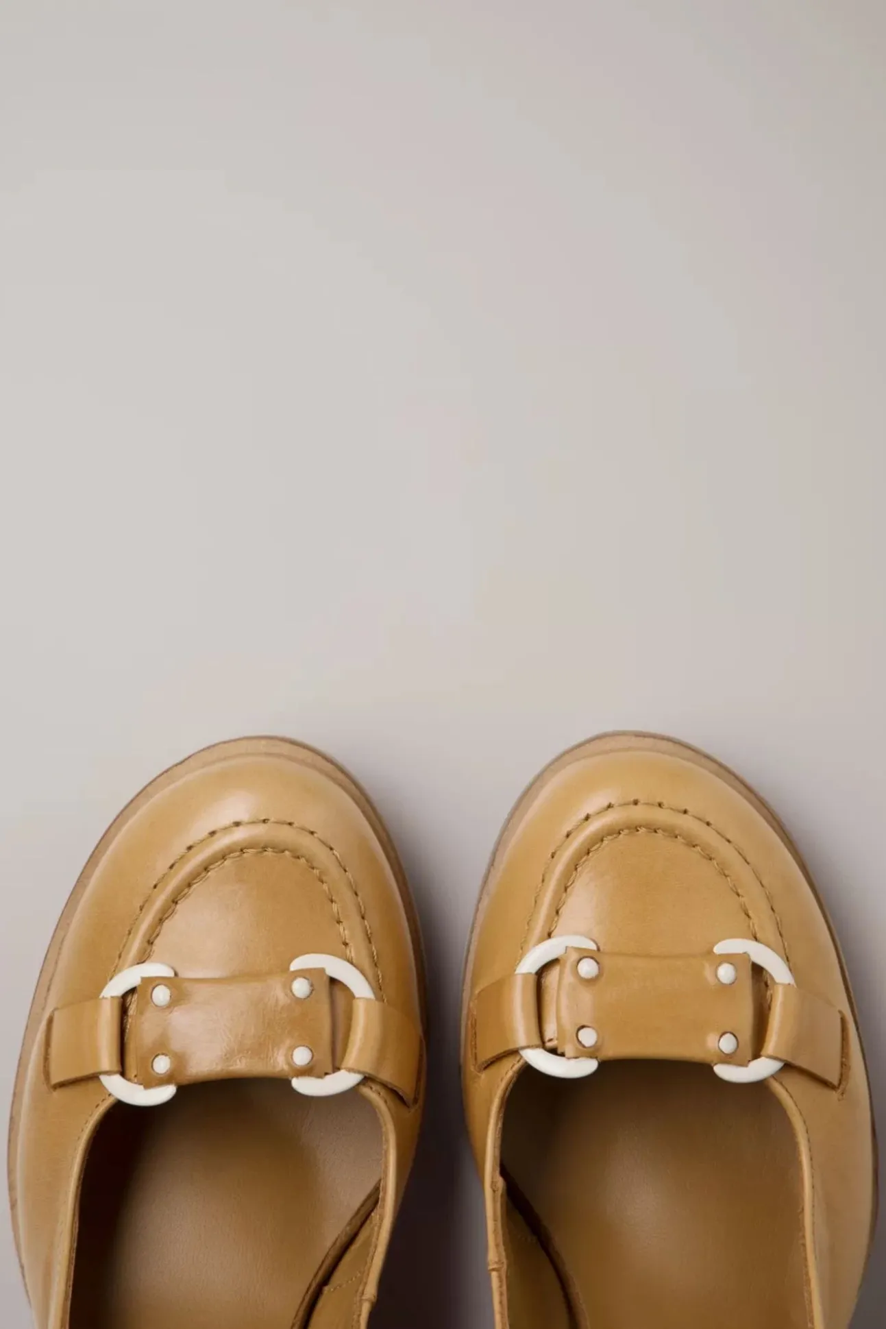 ”swing It Back… Sling It Back!” Slingback Pumps Uitgevoerd In Hoogwaardig Leder In Licht Cognacbruin, Voorzien Van Een Verstelbaar Bandje, Een Roomwit Gesp Detail En Een Blokhak Met Een Grafisch Printje.