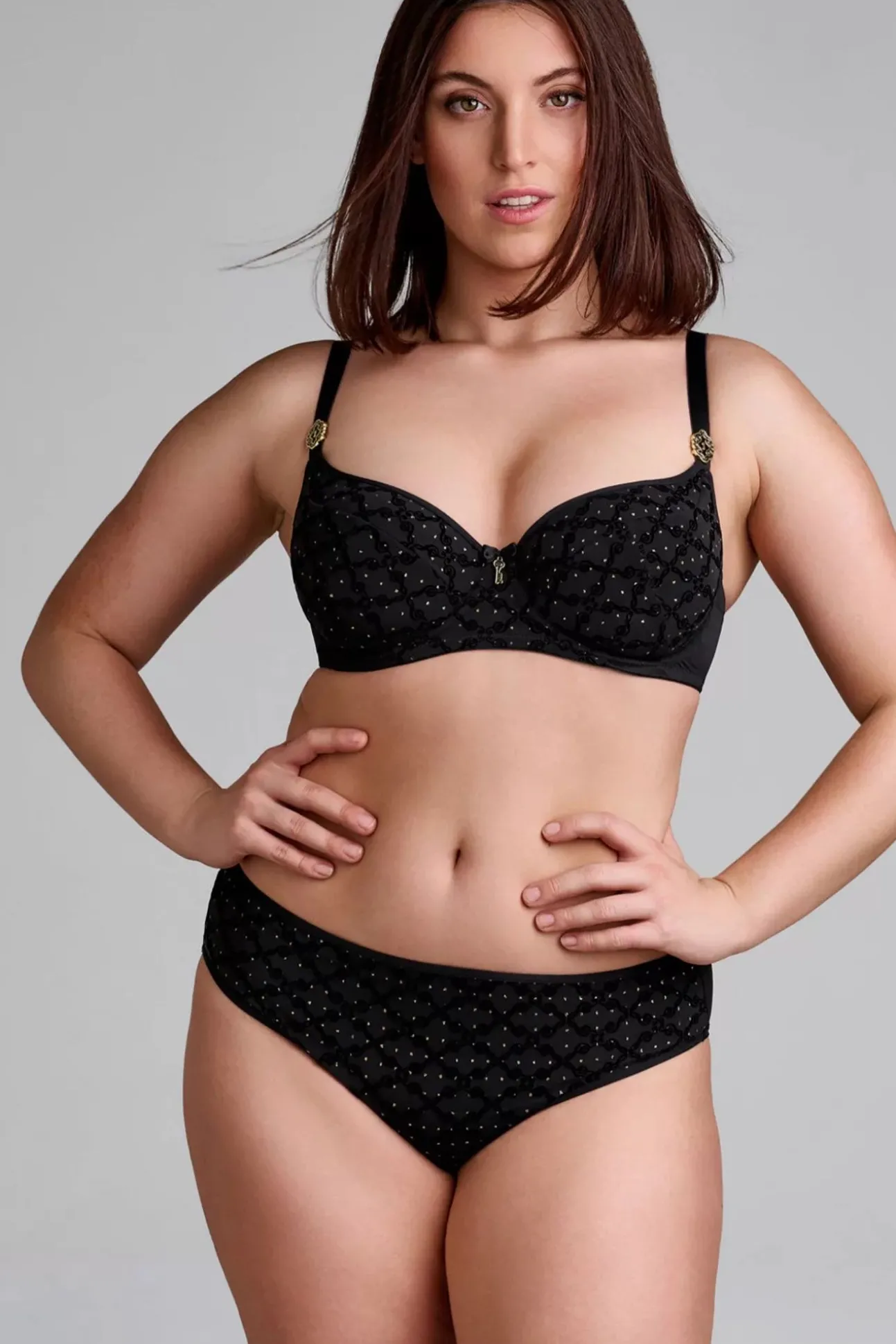 Laat Me Je Voorstellen Calliope, De Kroonjuweel Van Jouw Lingerielade! Deze Verleidster Creëert Een Subtiel Decolleté En Zorgt Voor Een Comfortabele Bedekking Met Beugels Die Je Borsten Omsluiten. De Beha Is Gemaakt Van Zwarte Stof Met Bovenop Gerecycled Zwarte Mesh, Wat Een Elegante Uitstraling Geeft Met Een Duurzame Touch. De Flockprint Met G-Sleutels En Sprankelende Gouden Stippen Geven Het Ontwerp Een Unieke, Weelderige Textuur. Als Extra Luxe Touch Zijn Op Beide Schouderbanden Sleutelgatvormige Ornamenten Aangebracht, Met De Hand Gevuld Met Zwart Emaille. En De Bijpassende Sleutel Siert Het Midden Van Je Decolleté. Mis Deze Onmisbare Toevoeging Aan Je Lingerielade Niet! 😉