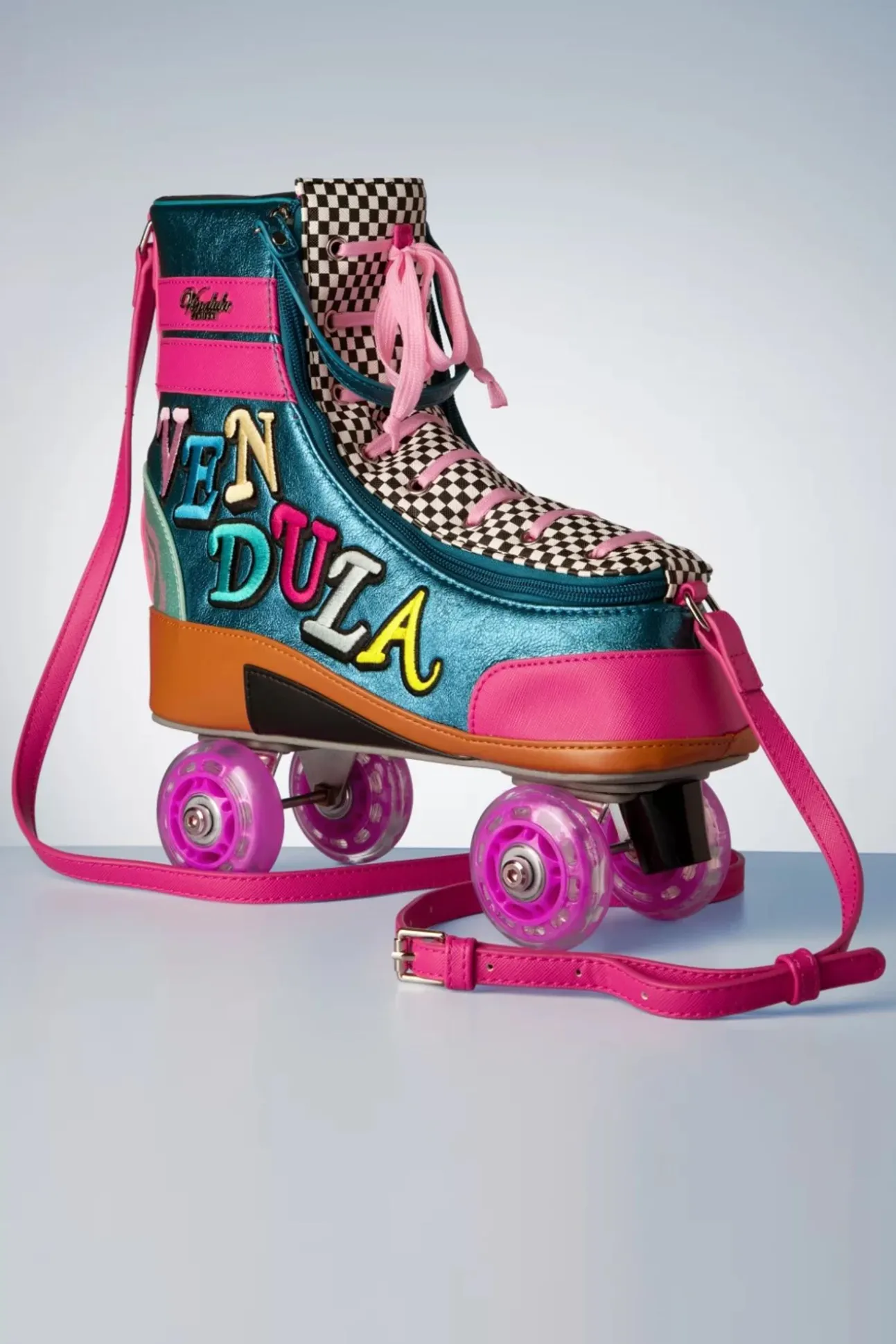 ”Let The Good Times Roll!” Het Is Bijna Onmogelijk Te Omschrijven Hoe Mooi Deze Handgemaakte Tas Is. Dit Model In De Vorm Van Een Rolschaats Met Veters En Wieltjes Is Uitgevoerd In Een Combinatie Van Metallic Tealblauw En Roze Vegan Leder Met Glitters En Een Zwart/Wit Geblokt Stofje. ”When In Doubt, Skate It Out!”
