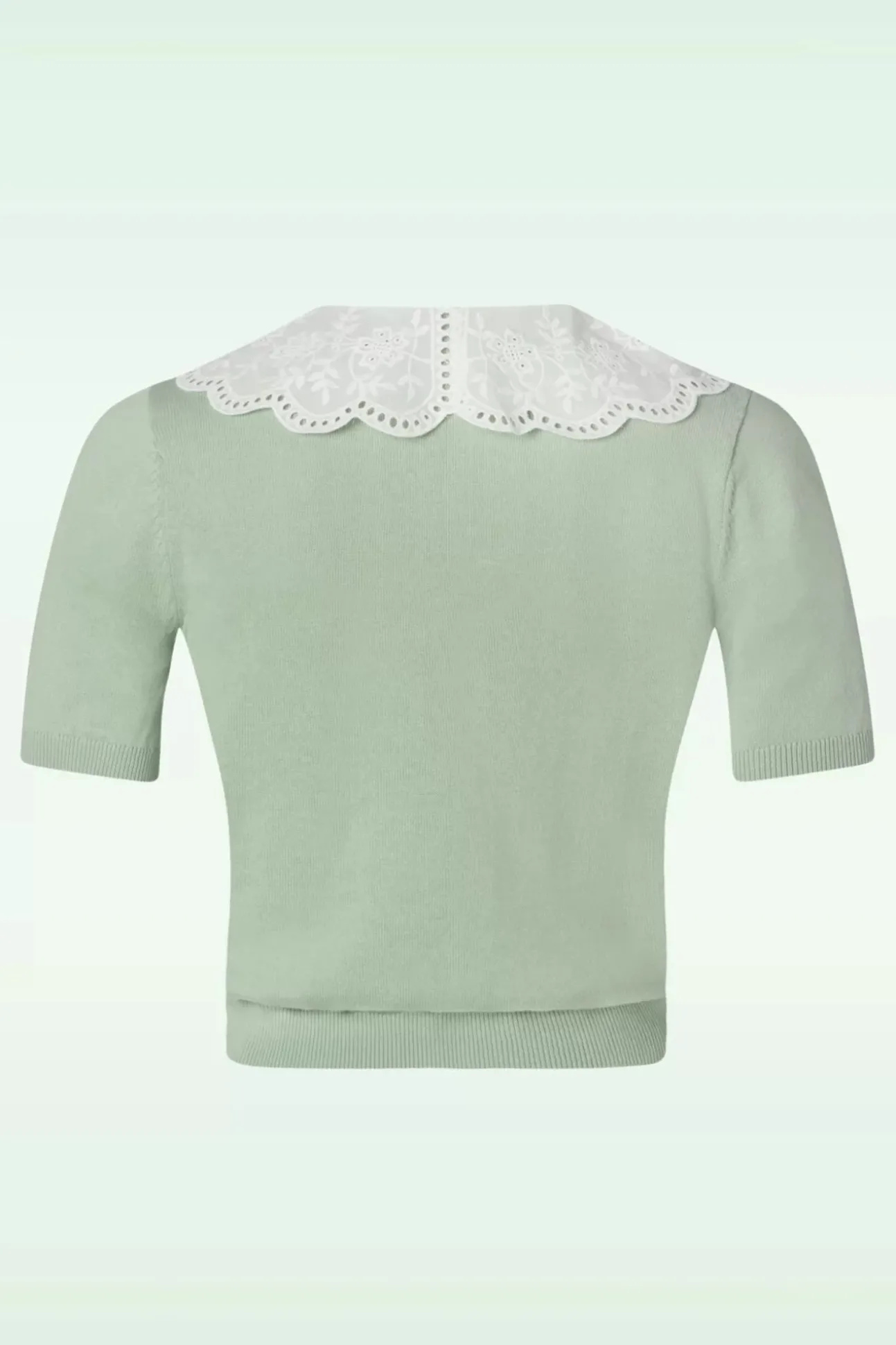 Hey Cutie! Deze Schattige Cardigan Is Uitgevoerd In Pastelgroen Katoen En Is Voorzien Van Een Contrasterende Broderie Kraag. Zie Jij Alle Fantastische Combi’s Al Voor Je?
