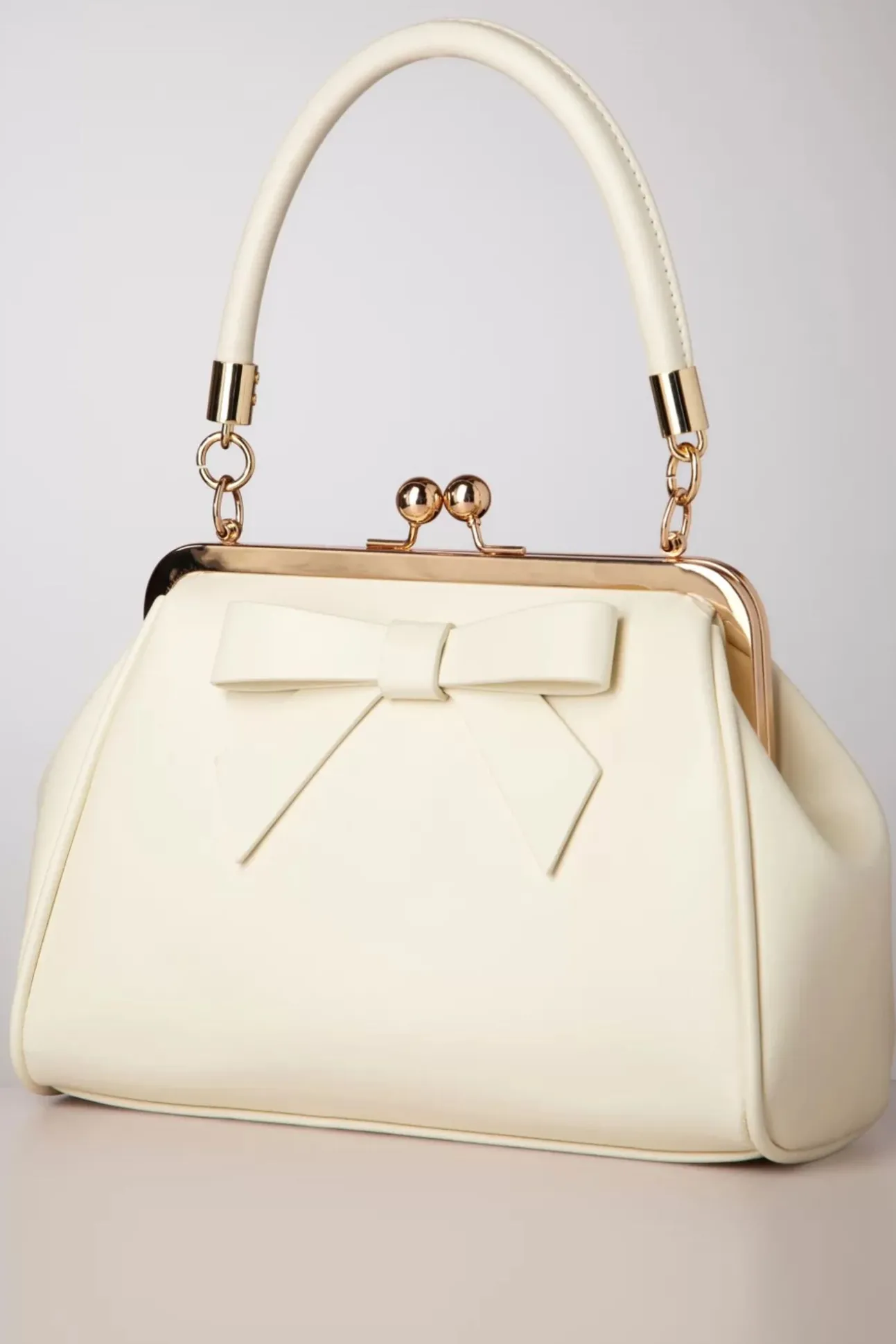”Just A Daydream Away!” Dit Kleine Zusje Van De Klassieke American Vintage Bag Heeft Een Opvallende Goudkleurige Metalen Klipsluiting Voor Een Echte Vintage Look En Is Uitgevoerd In Crèmekleurig Mat Imitatie Leder Afgewerkt Met Een Schattige Strik.