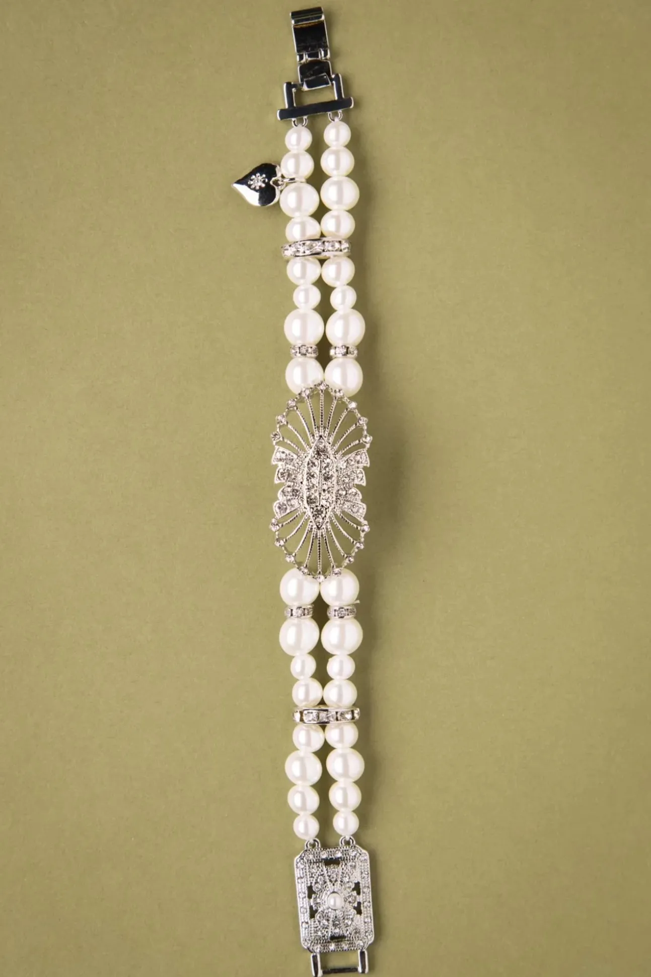 Deze 20S Deco Pearl Bracelet In Ivory Is Een Pronkstuk Dat Je Voor Altijd Bij Je Zal Dragen! Geïnspireerd Op De Roaring Twenties En Uitgevoerd In Zilverkleurig Metaal, Top Kwaliteit ‘Faux’ Parels En Fonkelende Strass Steentjes. Het Hartvormige Bedeltje Maakt Het Geheel Helemaal Af. Ga Terug In De Tijd En Maak Je Great Gatsby Look Af Met Deze Oogverblindend Mooie Armband!