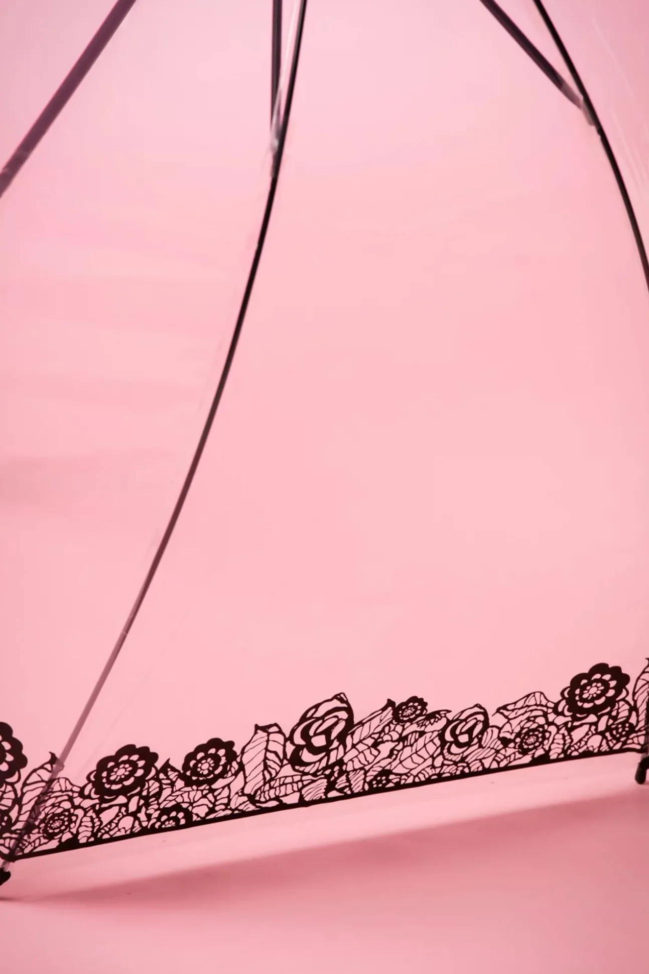 Handig En Fabulous Deze 60S Dentelle Flower Transparent Dome Umbrella, Je Ziet Precies Waar Je Loopt In De Regen! Dit Schattige Exemplaar Met Zwarte Bloemen Zorgt Ervoor Dat Jij De Regen Uit De Lucht Kijkt! Het Transparante Scherm Is Gemaakt Van Waterdicht Polyester Met Een Zwarte Rand En Is Afgewerkt Met Een Zwart Kunststof Handvat. De Paraplu Opent Eenvoudig Met Één Druk Op De Knop. I’M Singin’ In The Rain… Looking Fab As Always!