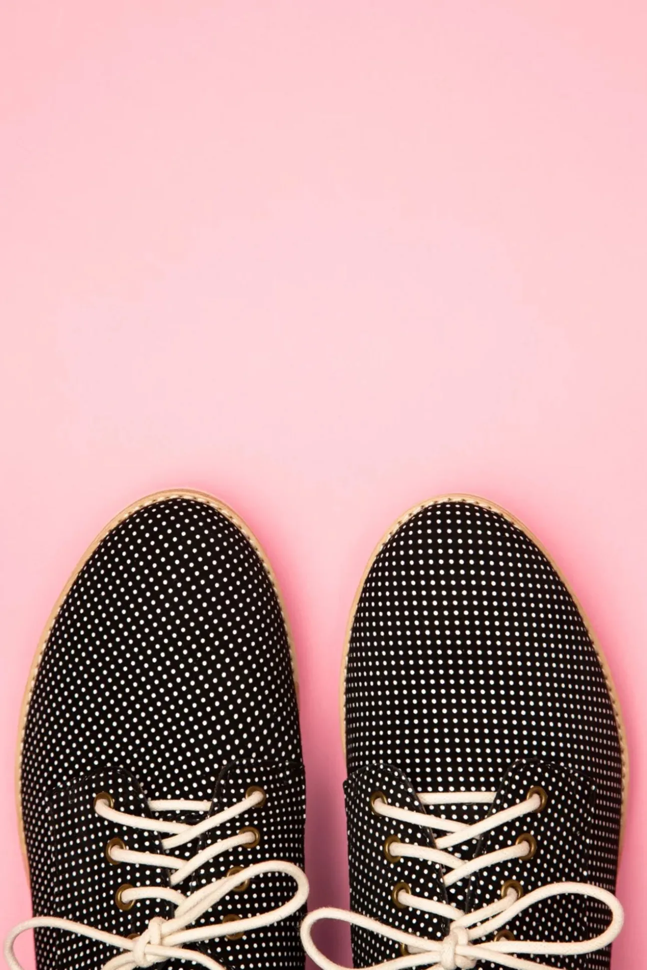 Deze Retro 60S Derby Dream Shoes In Black Voldoen Aan Al Je Eisen Waardoor Je Zelfs Je Hakken Even Opzij Laat Staan 😉 Ben Jij Een Vintage Loving Lady Die Graag Wat Cultuur Opsnuift Tijdens Een Stedentrip Of Korte ‘Getaway’? Of Struin Jij Makkelijk Een Hele Dag Alle Winkelstraten Af? Ook Dan Wil Je Er Natuurlijk Op En Top Uitzien Maar Om Nou Je Hakken Mee Te Nemen?! Deze Te Gekke Lichtgewicht Derby Veterschoentjes Zijn De Uitkomst; Fun, Stijlvol En Ongelooflijk Comfortabel! Gemaakt Van Hoogwaardig Soepel En Ademend Suède In Zwart, Voorzien Van Speelse Witte Pindots En Afgewerkt Met Een Handige Vetersluiting. De Memory Foam Binnenzool In Combinatie Met De Iets Dikkere Buitenzool Van Rubber Zorgen Ervoor Dat Je Die Hakken Vaker In De Kast Gaat Laten Staan… Wedden? 😉