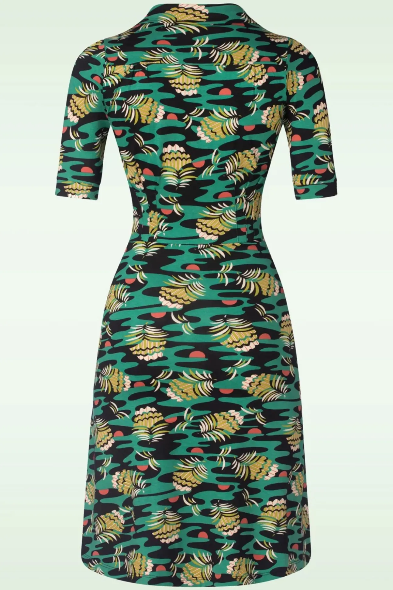 Opzoek Naar Een Speels Jurkje In Sixties Stijl Dat Net Even Anders Is Dan Alleanderen? Dan Is Deze Diner Pica Dress In Black Echt Iets Voor Jou! Met Een Echt American Diner-Model, Korte Mouwtjes En Reverskraagje Ademt Dezejurk Één En Al Vintage! Niet Alleen Het A-Lijntje Is Super Flatterend, Maar Deplooitjes In De Taille Richting De Borst Zorgen Ook Voor Een Mooi Slanksilhouet. Uitgevoerd In Een Zachte En Soepele, Stretchy, Zwart Met Groene Ecovero Viscosemix Voorzien Van Een Kleurrijke Zomerse Print. Deze Hoort Tochgewoon In Jouw Garderobe Thuis?
