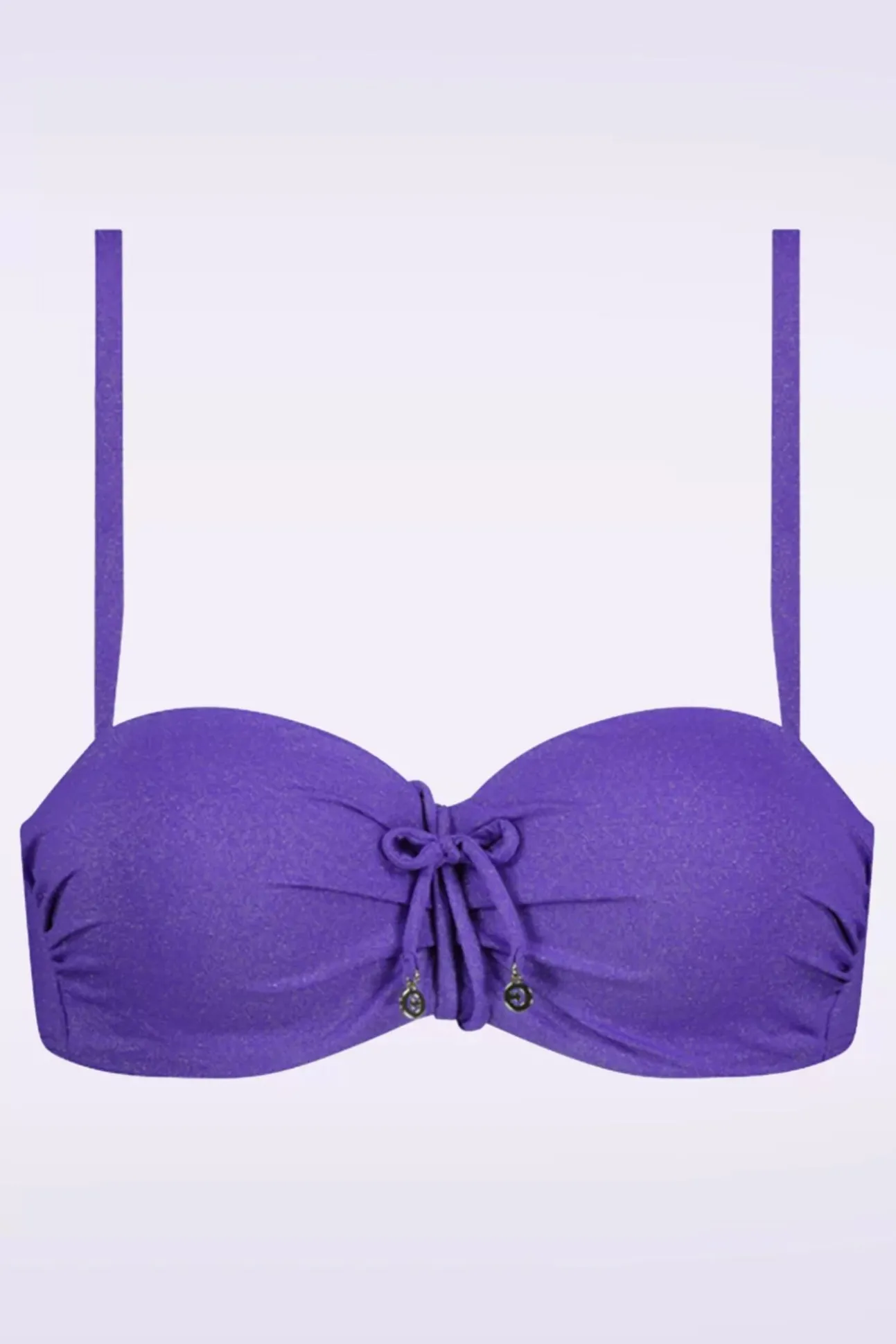 Nieuwe Lente/Zomercollectie ~ Het Strand Is Je Persoonlijke Catwalk Als Je Deze Bikini Top Draagt! Voorzien Van Een Beugel En Padded Cups Die Zorgen Voor Steun En Je Voorzien Van Een Prachtig Decolleté. Je Kunt Deze Top Op Meerdere Manieren Dragen; Met Schouderbandjes, Strapless Of Als Halter. Afgewerkt Met Plooitjes En Een Vast Strikdetail Tussen De Cups. Uitgevoerd In Een Comfy, Perfect Aansluitend Paars Stofje Met Een Goudkleurige Glitter Voor Een Beetje Glamour In The Sun. ”Too Glam To Give A Damn!”