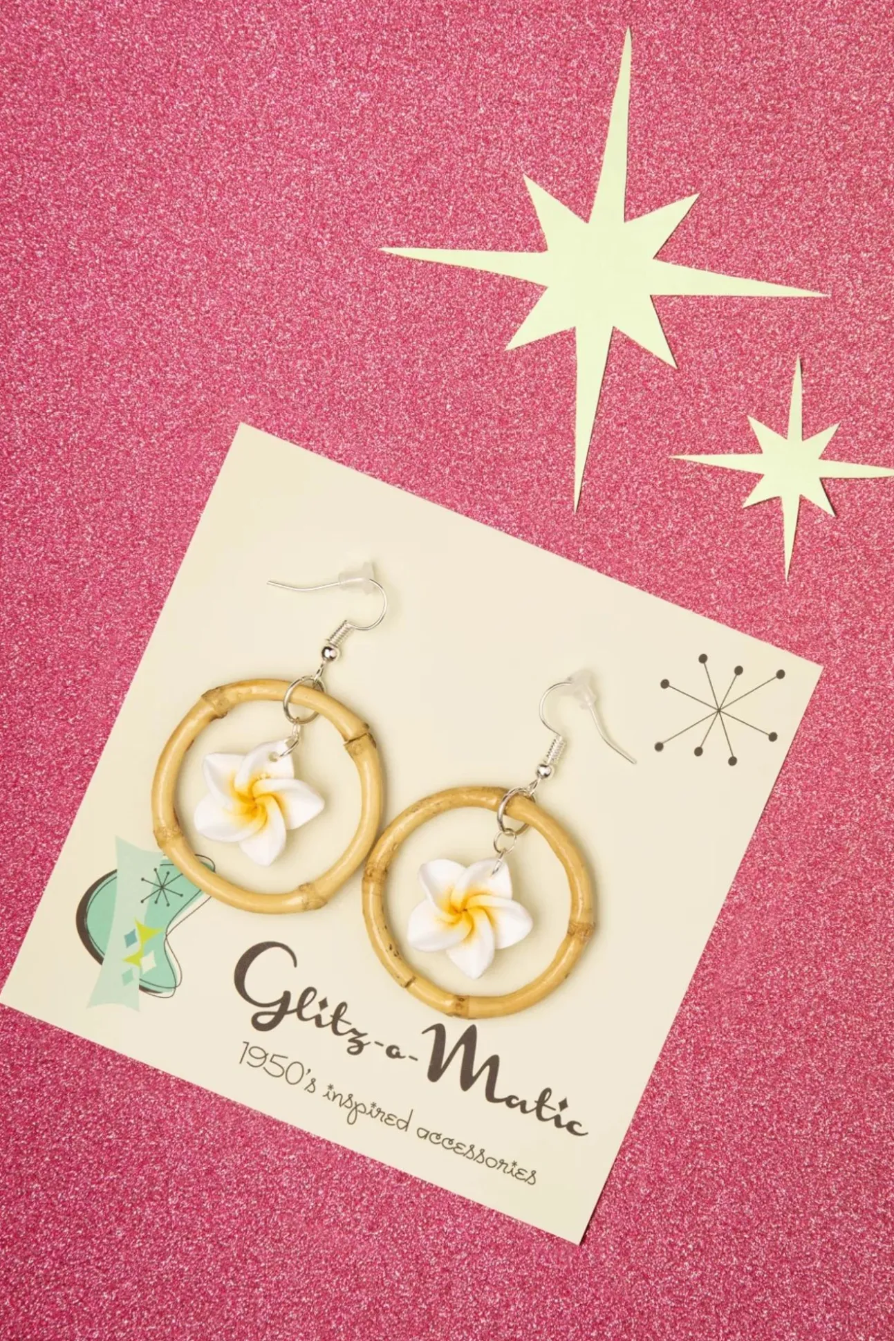 Met Deze 50S Floral Bamboo Hoop Earrings In White Maak Jij Je Tropische Tiki Outfit Helemaal Compleet! Deze Set Gelakte Ronde Oorhangers Van Bamboe Zullen Je Oren Op Prachtige Wijze Sieren, Terwijl Het Bloemetje In Wit Er Een Extra Tropische Twist Aan Geeft! Een Geweldig Mooi Handgemaakt En Uniek Sieraad. Met Deze Cuties In Je Oren Stijgen De Temperaturen Vanzelf Naar Tropische Hoogtes!