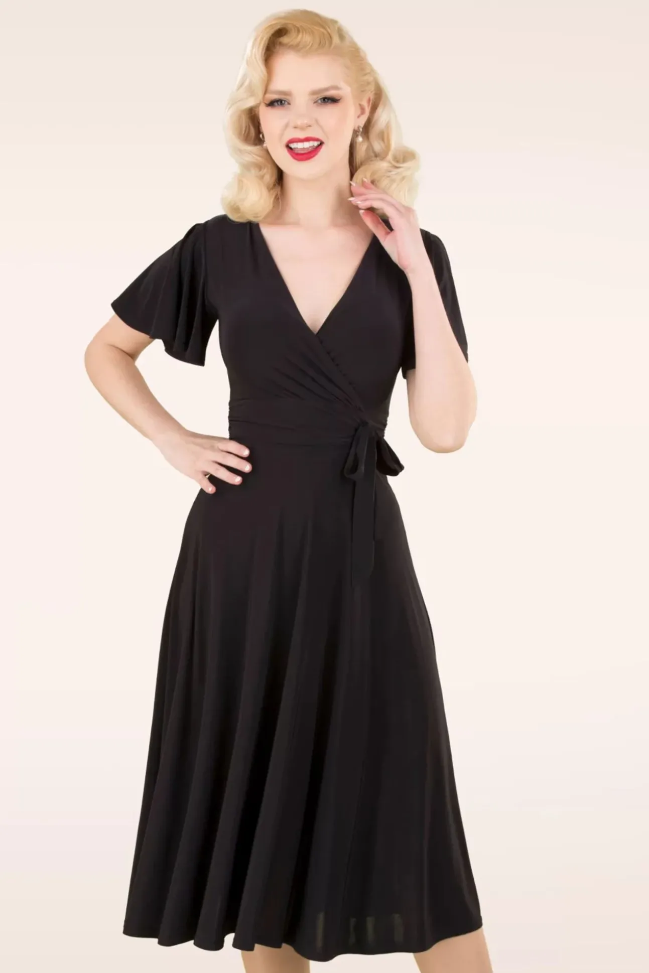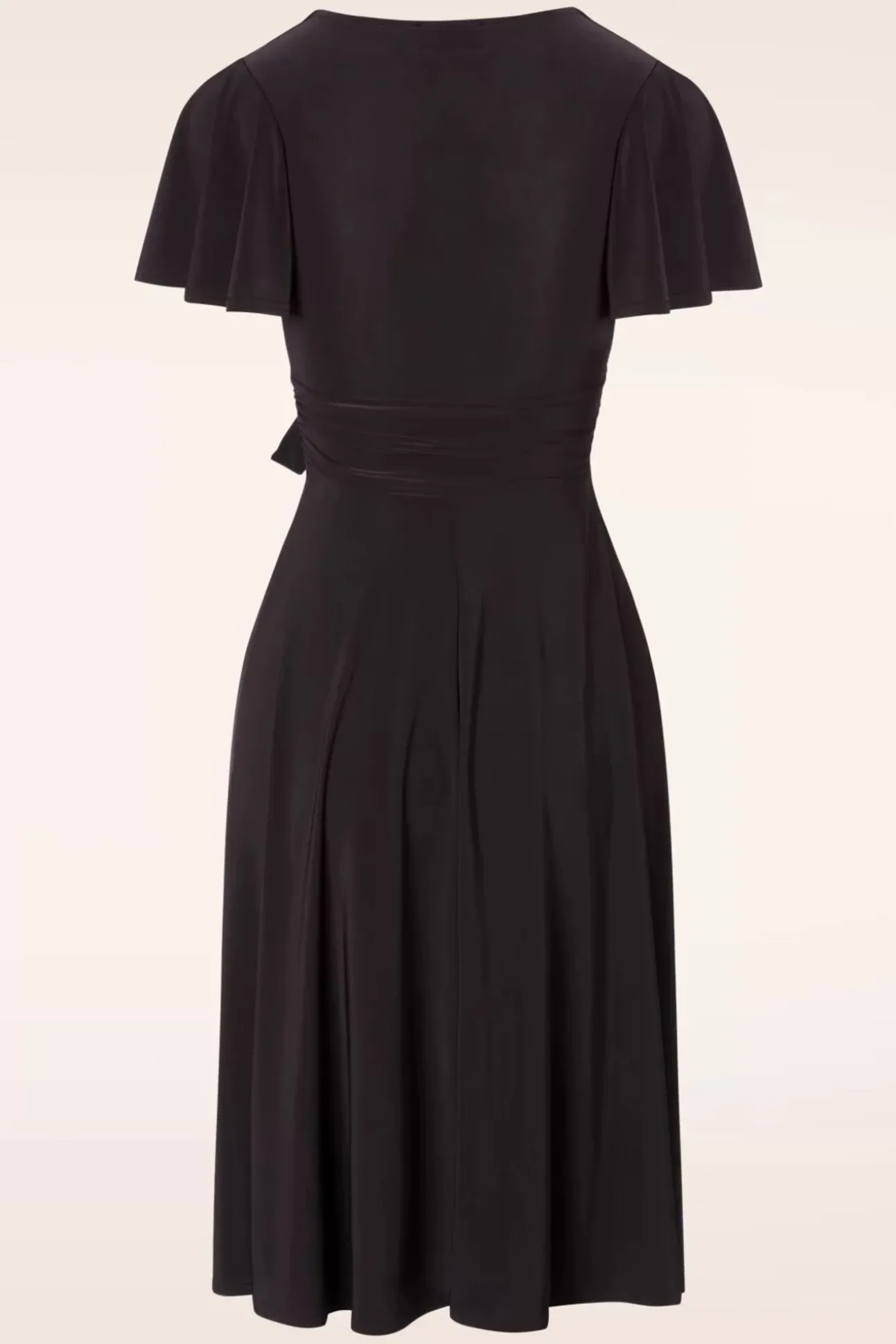 Flirt De Hele Dag In Deze 40S Irene Cross Over Swing Dress In Black! Wanneer Je Irene Aantrekt Weet Je Het Meteen; Ze Is Perfect! Ze Laat Je Op En Top Vrouw Voelen Door De Prachtige Aansluitende Overslag Top Met Een Sexy V-Halslijn, Speelse Strikbandjes Die Je Zowel Los Als Gestrikt Kunt Dragen En Haar Flatterende Plooien Aan De Zijkant. De Zwierige Vlindermouwtjes Geven Haar Een Flirty Touch Terwijl De Flatterende Semi-Swing Rok Zorgt Voor Een Flinke Portie Elegantie, Wow! Ze Is Uitgevoerd In Een Glad En Soepel, Licht Glanzend Zwart Stretchy Stofje Dat Garant Staat Voor Veel Kreukvrij Draagplezier. Irene Is Liefde, Pure Jurken-Liefde!