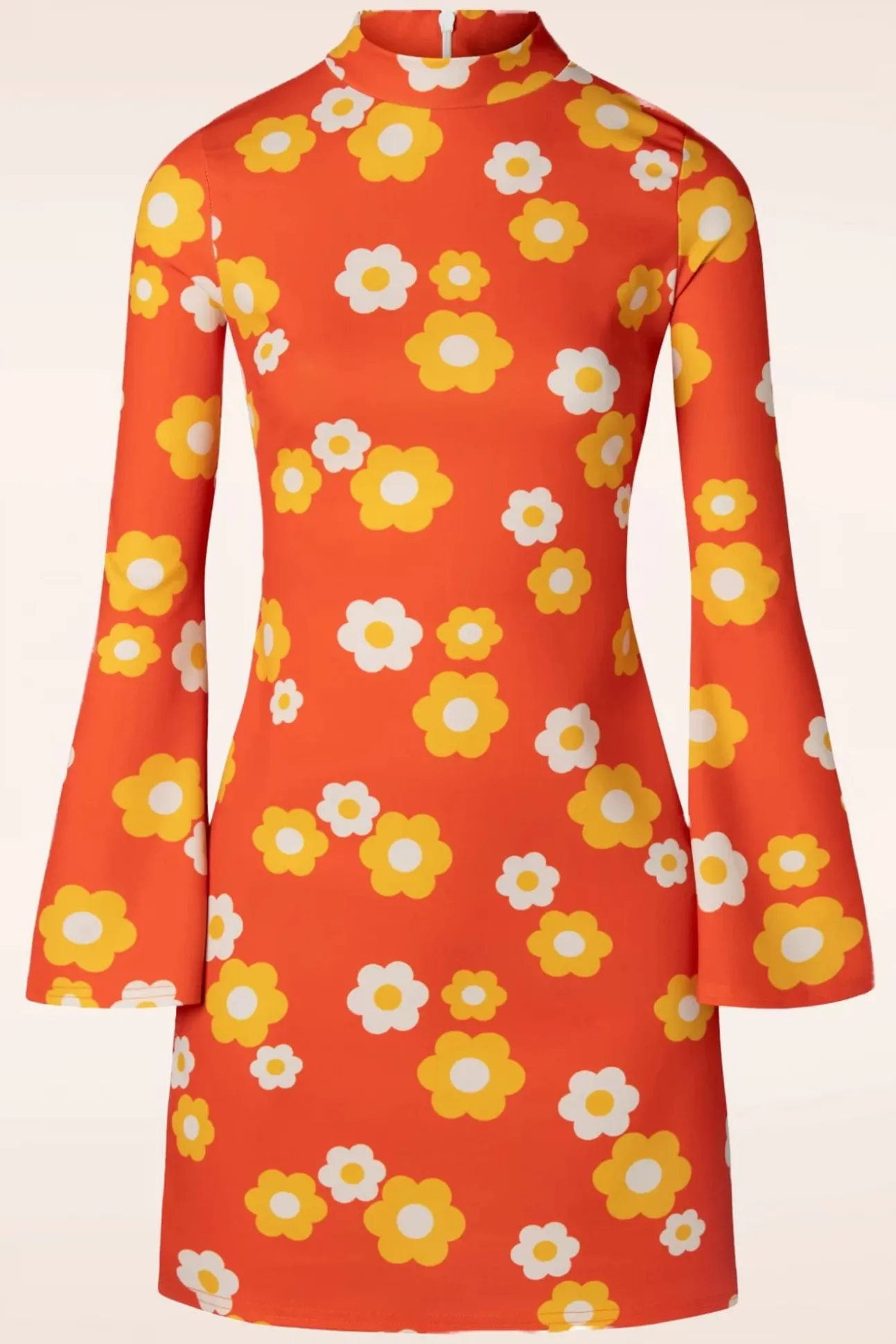 ‘Flower Power, Every Day, Every Hour’ Met Deze Izzy Flower Dress In Orange! Deze Seventies A-Lijn Dress Heeft Een Klein Opstaand Kraagje, Lange Flared Mouwen En Een Geweldige, Groovy Bloemenprint. Uitgevoerd In Een Soepele En Stretchy, Oranje Stof Die Heerlijk Draagt. Bloom Baby, Bloom!