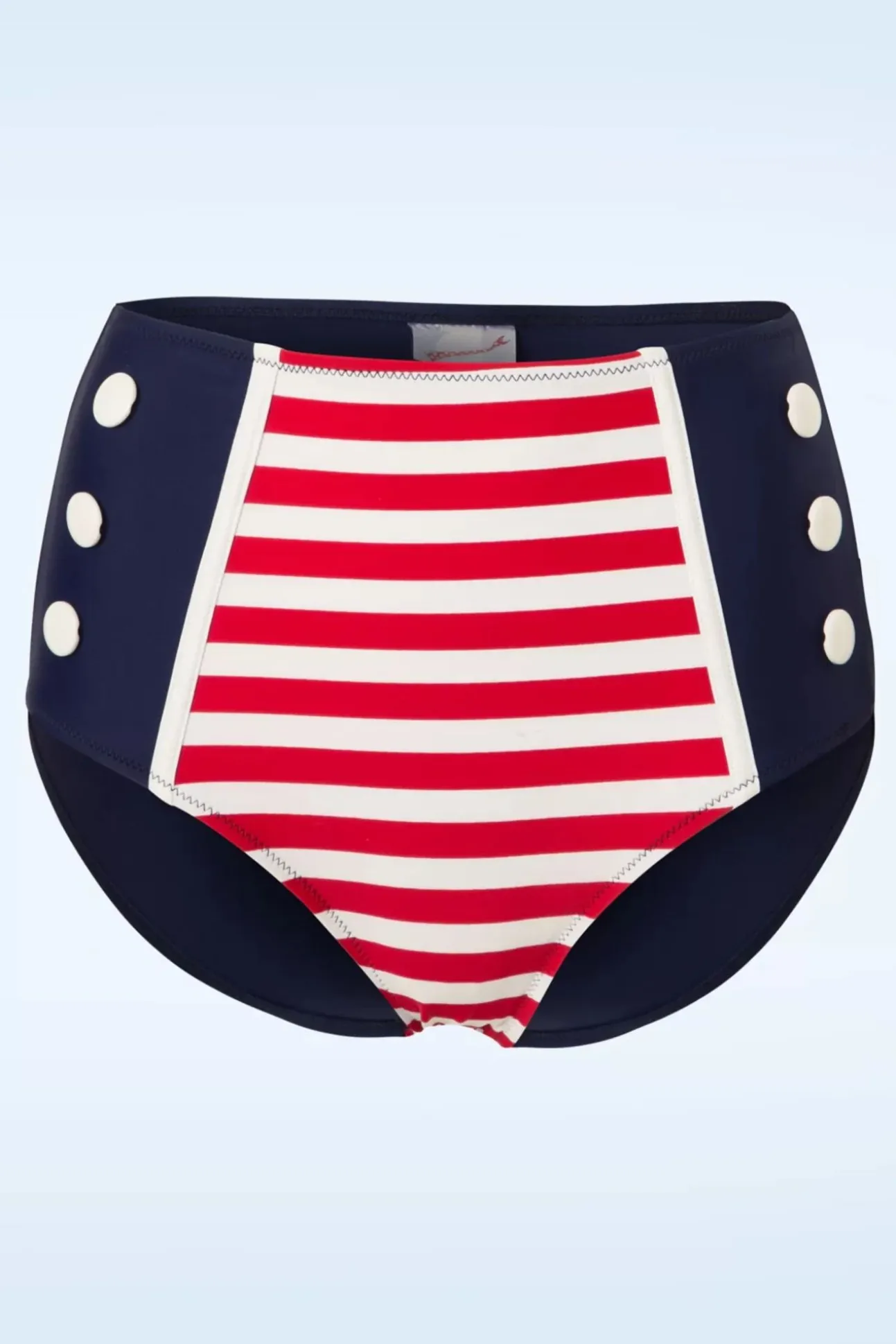 Die Ene Leuke Marinier? Laat Zijn Hart Smelten Met Deze 50S Joelle Stripes Bikini Pants In Navy And Red! Dit Broekje Met Contrasterende Rode/Witte Streepjes En ‘Faux’ Knoopjes Wordt Hoog In De Taille Gedragen Waardoor Jij Een Onweerstaanbaar Vrouwelijk Silhouet Krijgt En Tevens Eventuele Buikprobleempjes Verdoezelt. Uitgevoerd In Een Comfortabel, Stretchy Stofje Dat Heerlijk Draagt En Perfect Aansluit. We Like Sailors… But We Love The Sailor Style!