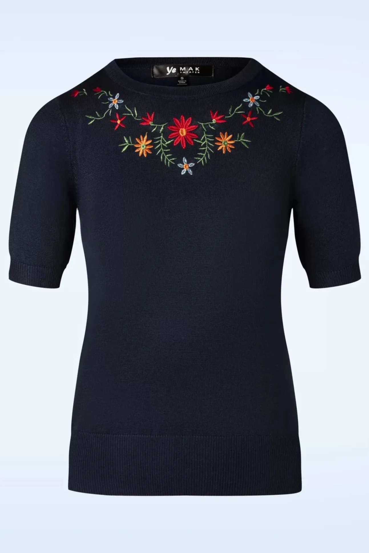 Fleur Je Dag Op Met Deze 50S Julie Floral Top In Marineblauw! Online In Nederland, Duitsland En Frankrijk Exclusief Verkrijgbaar Bij Topvintage! Julie Heeft Een Klassieke Snit Met Een Ronde Halslijn, Korte Mouwen En Stretchy Ribboord Voor Een Mooie Pasvorm. Uitgevoerd In Een Heerlijk Dunne, Fijngebreide, Stretchy, Marineblauwe Viscosemix Voorzien Van Kleurrijk Bloemenborduursel. Pluk De Dag Met Deze Top!