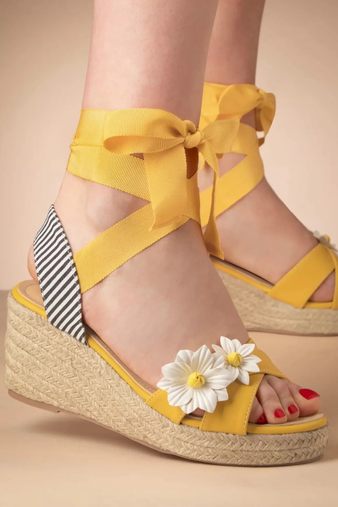 Je Spring Look Naar Een Hoger Niveau Liften Is Een Fluitje Van Een Cent Met Deze Lady Daisy Wedges In Yellow Aan Je Voetjes! Het Perfecte Alternatief Voor Je High Heels Want Ze Laten Je Benen Langer Lijken Terwijl Ze Heerlijk Comfortabel Zitten! Uitgevoerd In Zonnegeel ‘Faux’ Leder, Voorzien Van Strikbanden Die Je Gracieus Om Je Enkel Kunt Wikkelen, Prachtige Madeliefjes Op De Wreef En Natuurlijk Die Typische Raffia Plateau Zool. ”Oopsie Daisy, Added Them To My Cart Already!” 😉