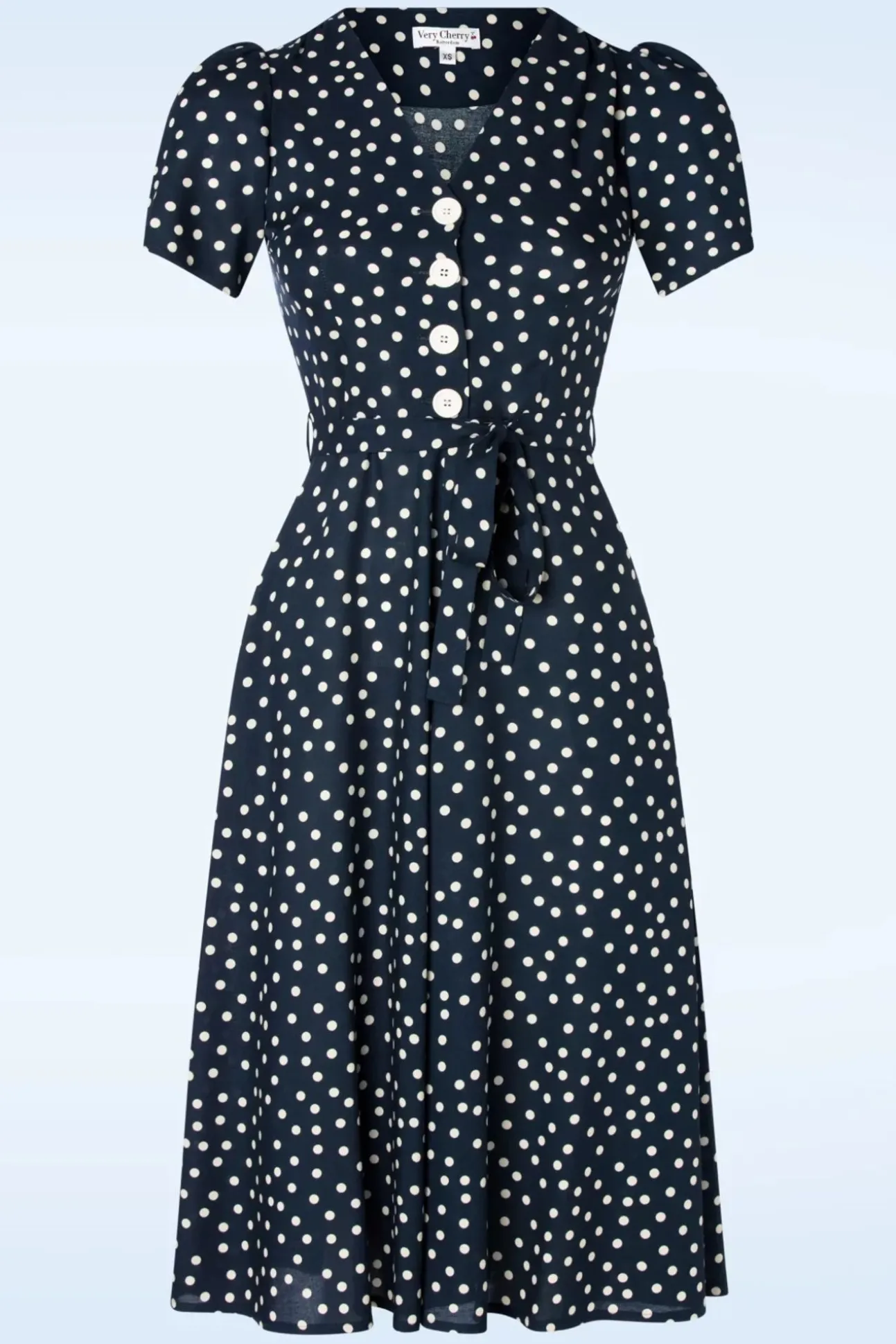 ”I Feel Pretty, Oh, So Pretty!” Uitgevoerd In Een Soepele, Non-Stretchy, Marineblauwe Stof Voorzien Van Een Witte Polkadot.