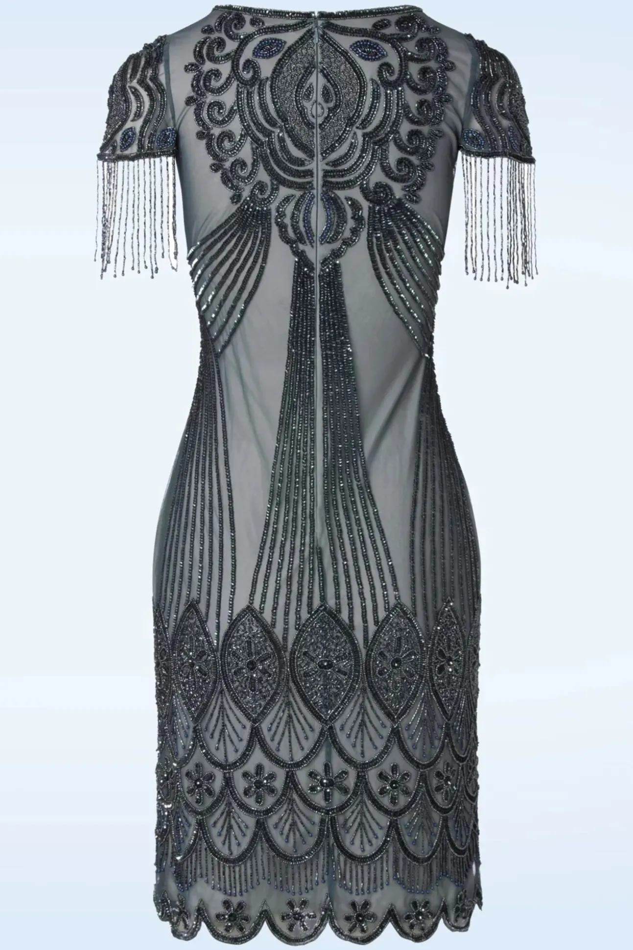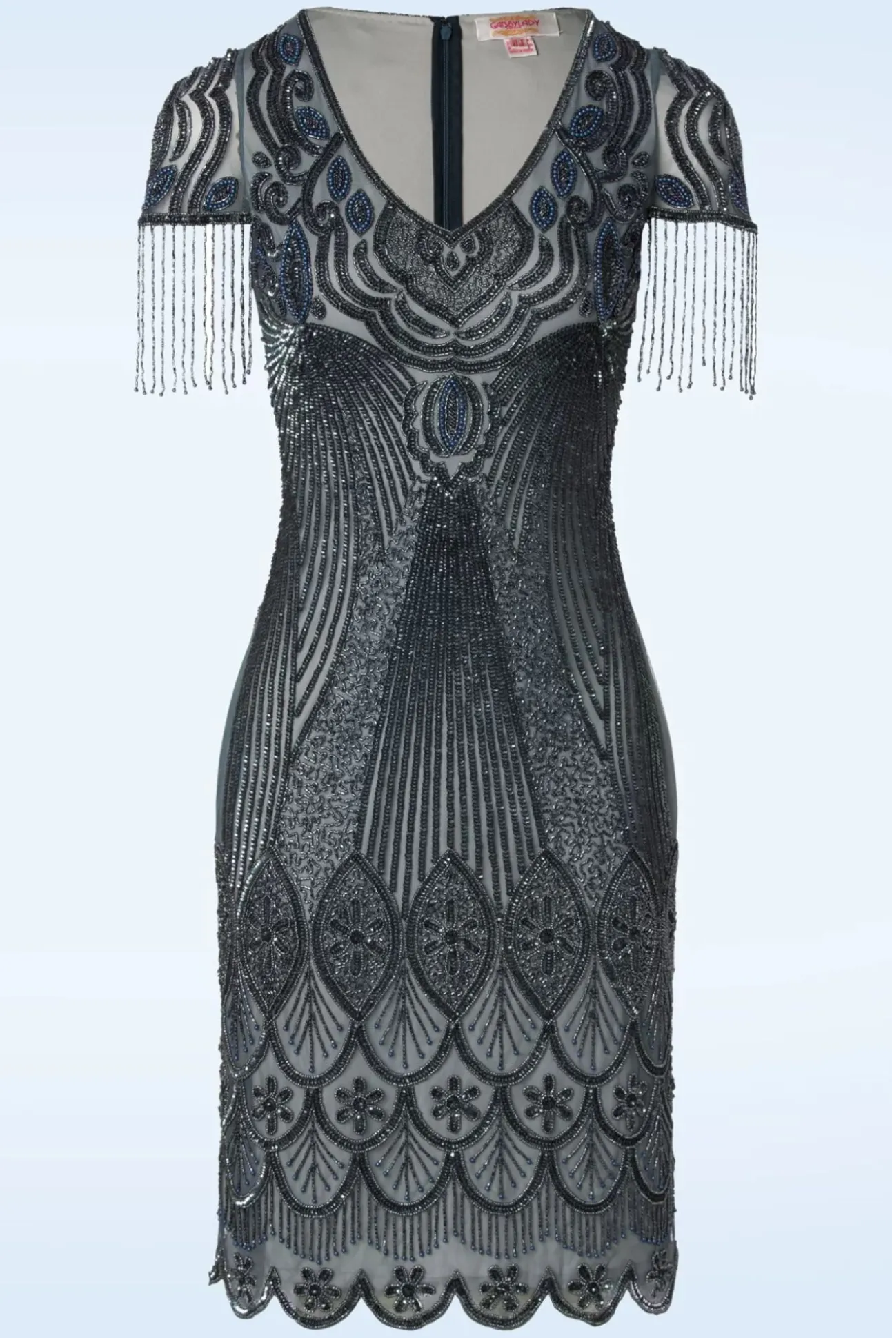 Deze 20S Marta Flapper Dress In Blue And Grey Is Een Prachtige Met De Hand Bewerkte Reproductie Van De Elegante Flapper Dresses Uit De Jaren 20! Laat Je Meenemen Naar De Lang Vervlogen Romantische En Glamorous Tijden! Deze Beauty, Je Haren Opgestoken Met Een Sprankelende Haar Clip En Een Droomman Aan Je Arm… Picture Perfect! Deze Showstopper Is Bezaaid Met Minuscule, Glimmende Glaskraaltjes En Pailletten In Grijs En Blauw Die Er Met De Hand Opgestikt Zijn, Wow! De Top Heeft Een Diepe V-Hals En Franjes Van Kraaltjes Langs De Korte Mouwtjes. Deze Beauty Heeft Geschulpte Randjes Langs De Onderkant En Valt Met Haar Loose-Fit Precies Zoals Een Flapper Dress Hoort Te Zitten. Ze Is Uitgevoerd In Een Grijsblauwe, Semi-Doorschijnende, Stretchy Stof En Is Gevoerd Voor Extra Draagcomfort. Nu Maar Hopen Dat Je Date Net Zo Galant Is Als De Mannen Van Vroeger 😉
