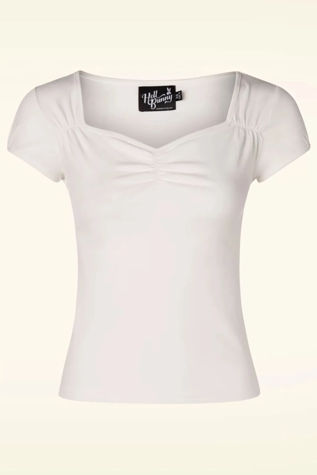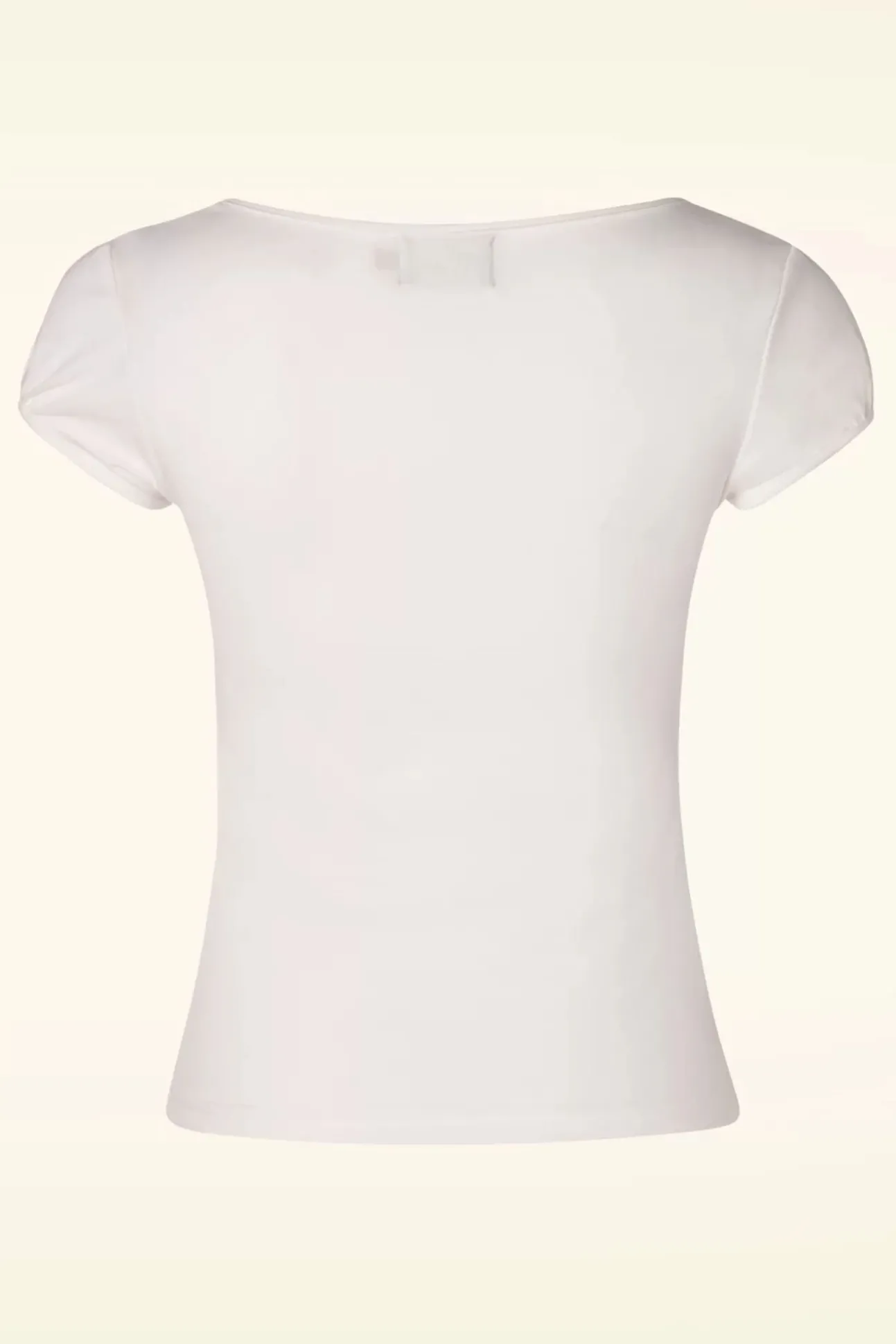 De 50S Mia Top In Ivory White Is Een Veelzijdige Top Inpin-Up Stijl! Ze Heeft Korte Mouwtjes En Een Elegante Diamantvormige Halslijn,Afgewerkt Met Charmante Plooitjes 😉 Uitgevoerd In Een Zachte,Stretchy Ivoorwitte Katoenmix Voor Een Heerlijk Draagcomfort. De Perfecte Top Die Overalmee Gecombineerd Kan Worden!