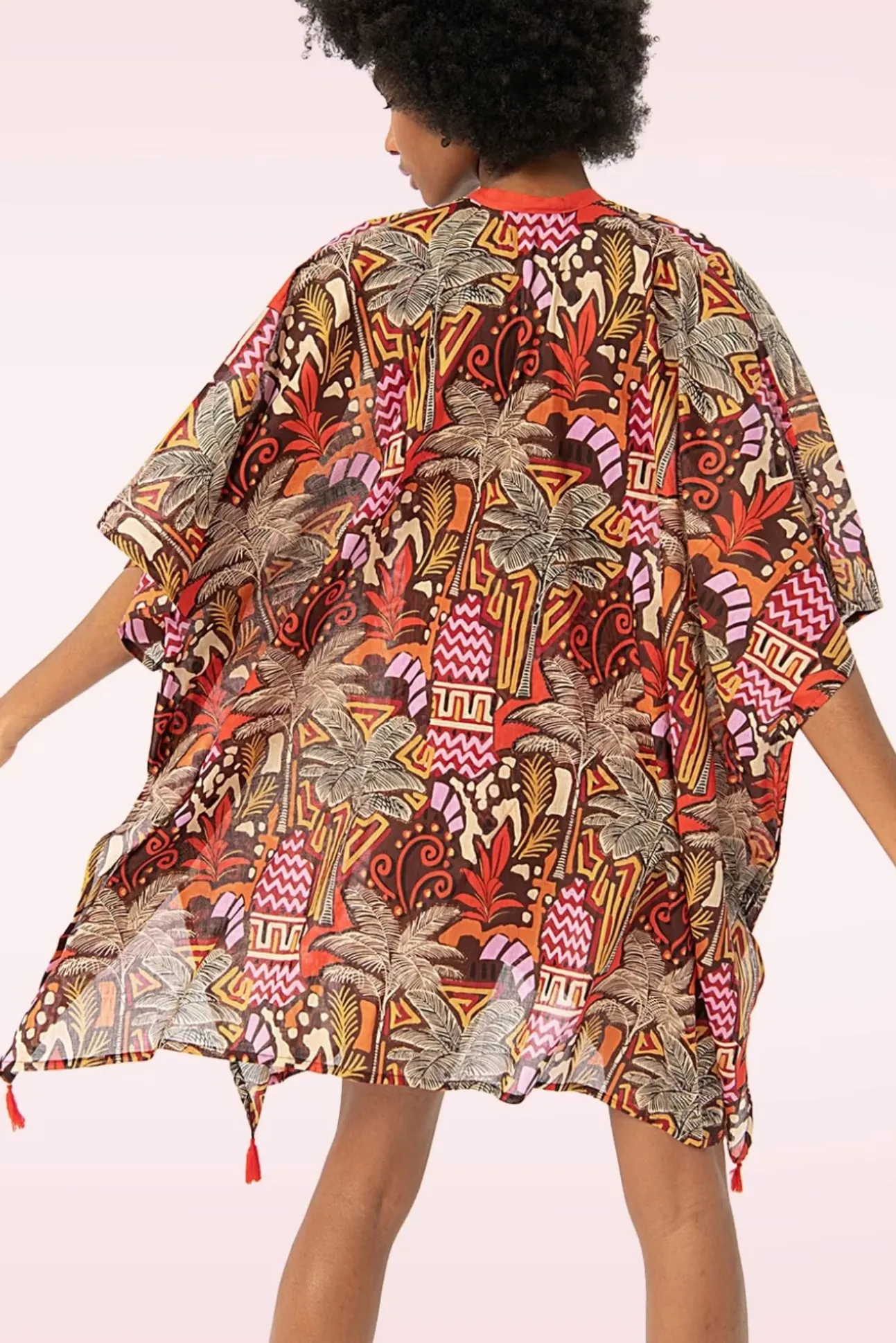”Another Day In Paradise!” Loungen Aan Het Zwembad Of Het Strand, Doe Je In Stijl In Deze Korte Kimono. Uitgevoerd In Een Heerlijke Soepele En Luchtige Katoen Voorzien Van Een Kleurrijke Bohemian Print Met Palmbomen.