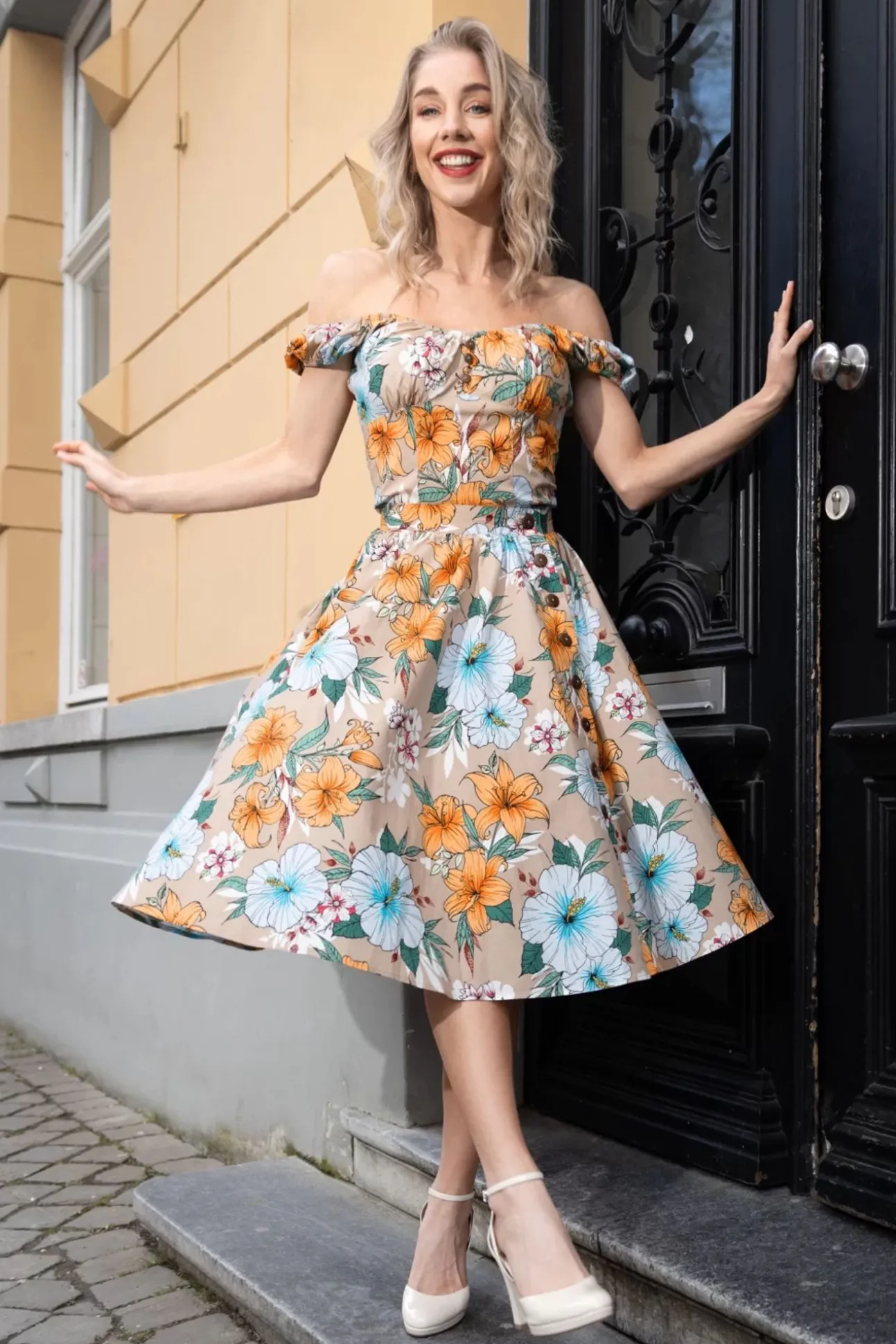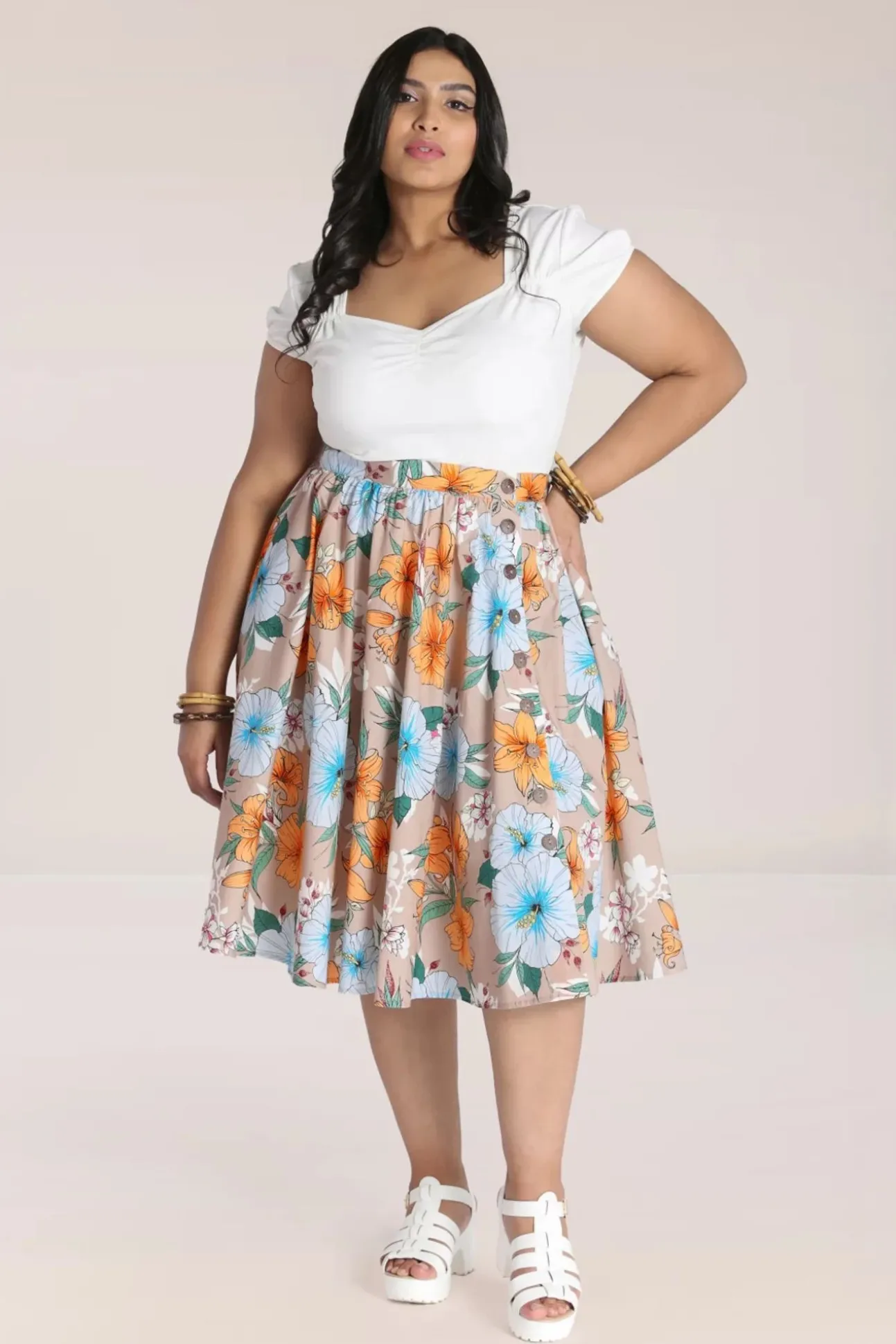 ”Paradise Is Calling!” Deze Rok Is Uitgevoerd In Een Luchtige En Soepele Beige Katoenmix Met Een Lichte Stretch En Voorzien Van Een Tropische Bloemenprint.