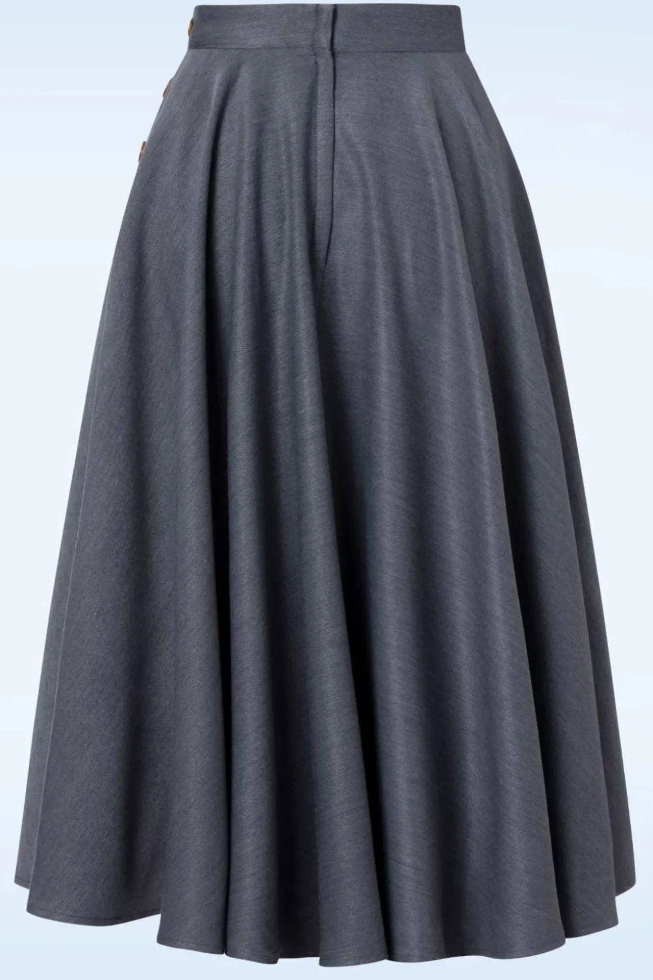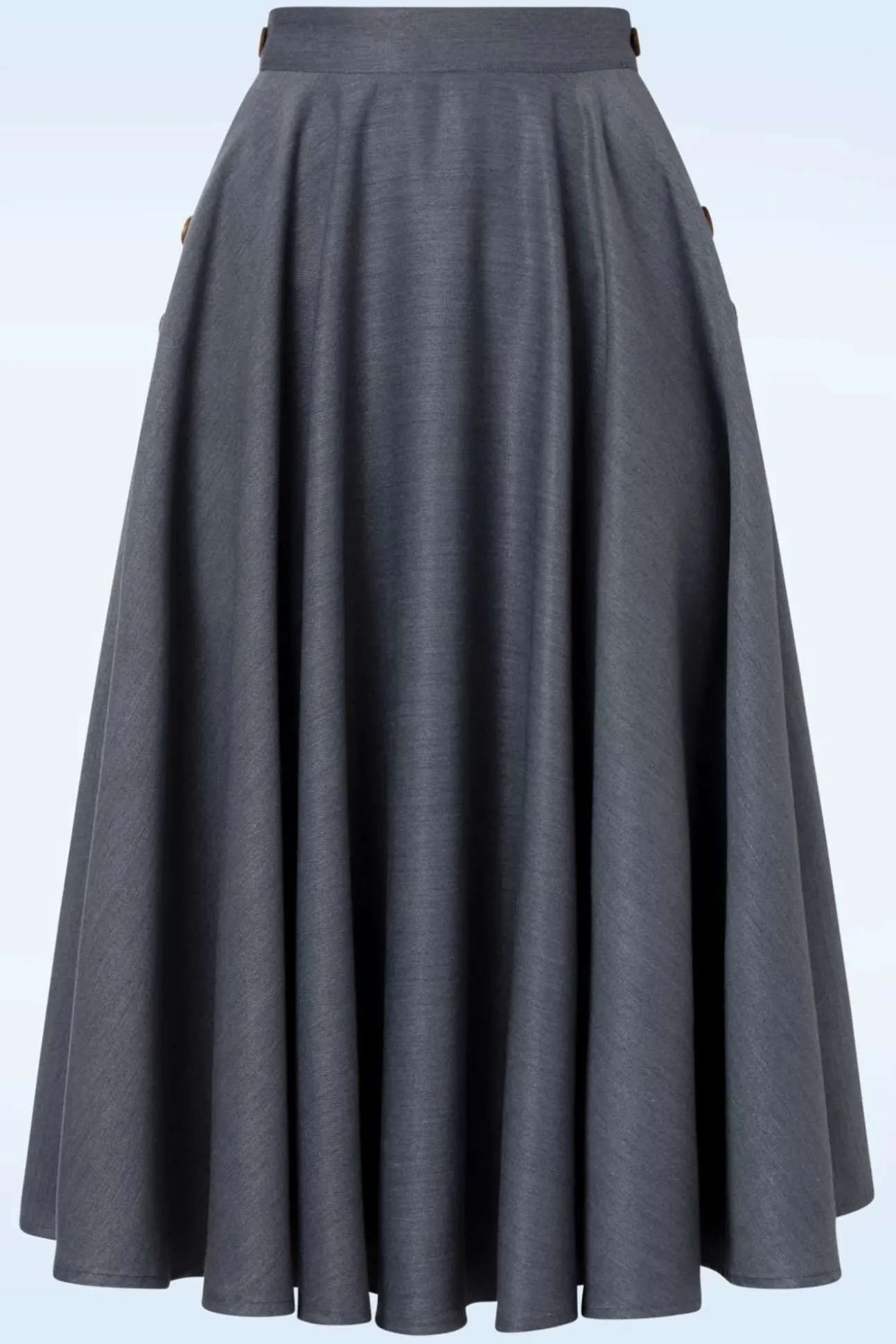 Klassiek, Tijdloos En Ontzettend Vrouwelijk! Deze Polly May Swing Skirt In Blue Kun Je Eindeloos Combineren! Je Draagt Haar Hoog In De Taille Vanwaar Zij Uitloopt In Een Elegante, Zwierige Swing Rok Met Zijwaartse ‘Faux’ Knoopdetails En Handige Steekzakjes. Uitgevoerd In Een Soepel Vallend, Denimblauw Stofje (Stretcht Amper) Die Heerlijk Draagt. Deze Swing Beauty Wordt Gegarandeerd Jouw Nieuwe Zomer Favoriet!
