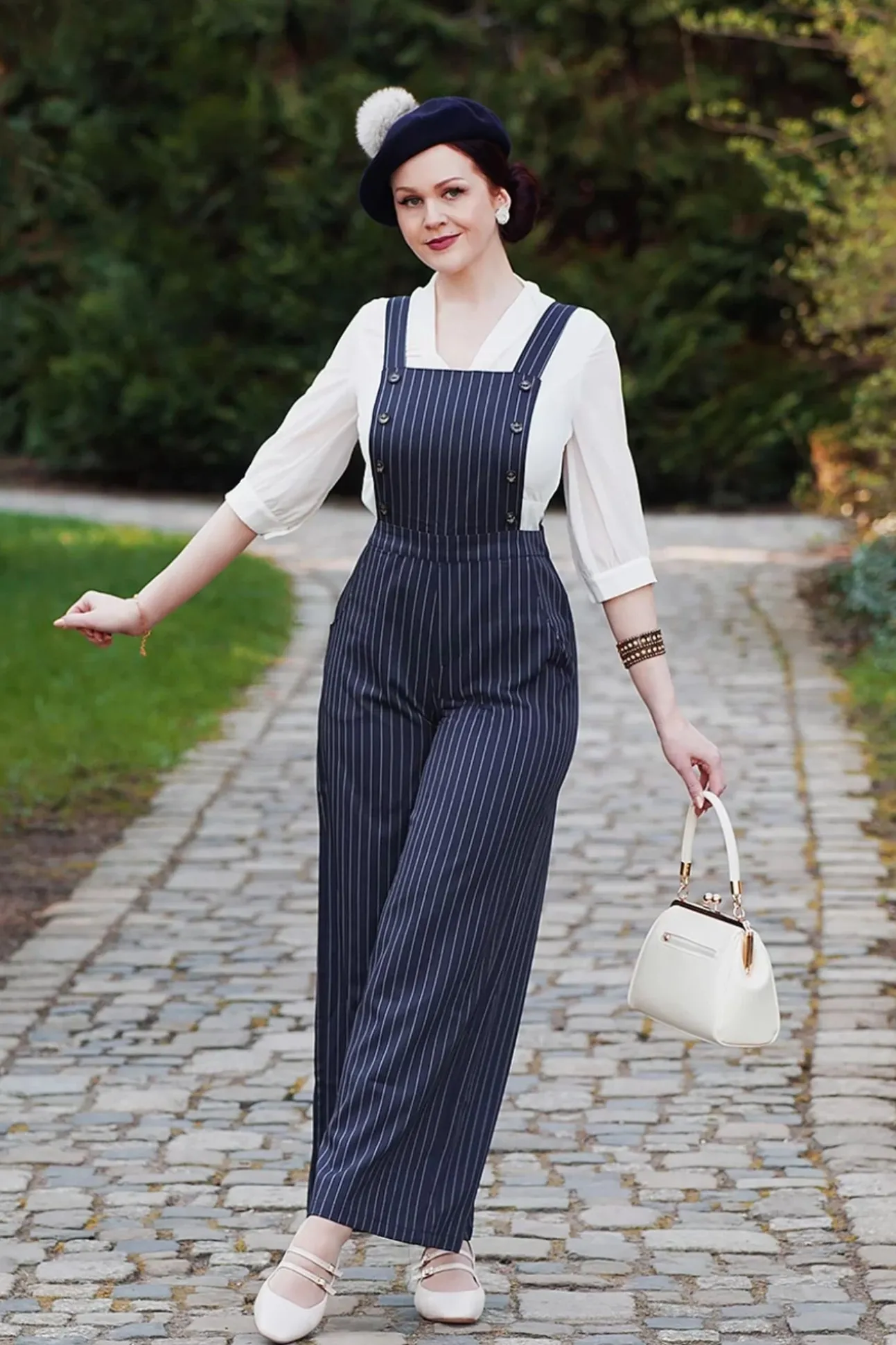 Lang Nadenken Over Je Outfit Behoort Tot Het Verleden Met Deze Dungarees! Uitgevoerd In Een Stevige Maar Soepele, Navyblauwe Stof (Stretcht Niet) Met Een Witte Krijtstreep Voor Een Heerlijk Draagcomfort En Is Afgewerkt Met ‘Faux’ Knopen Voorzien Van Ankertjes. Een Top Of Blouse Eronder, De Juiste Schoenen Erbij En Je Eye-Catching Retro Look Is Compleet!