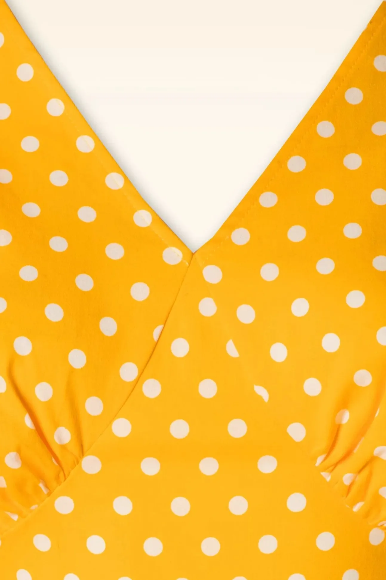 Met Deze Klassieke, Maar Flirty Swing Cutie Kom Je Deze Zomer Vast En Zeker Goed Door! Uitgevoerd In Een Luchtige, Gele Katoenmix Met Een Lichte Stretch, Voorzien Van Een Witte Polkadot Print. Wat Een ‘Dotje’!