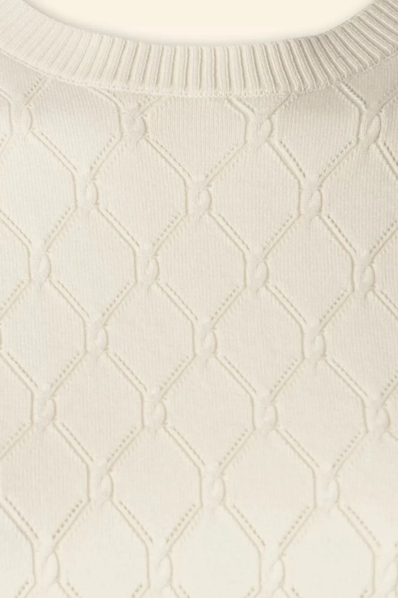 ”How Sweet Is Sally!” Deze Cutie Is Uitgevoerd In Een Soepele En Stretchy, Zachte, Fijn Gebreide, Crème Kleurig Stofje Voorzien Van Een Opengewerkt Patroon.