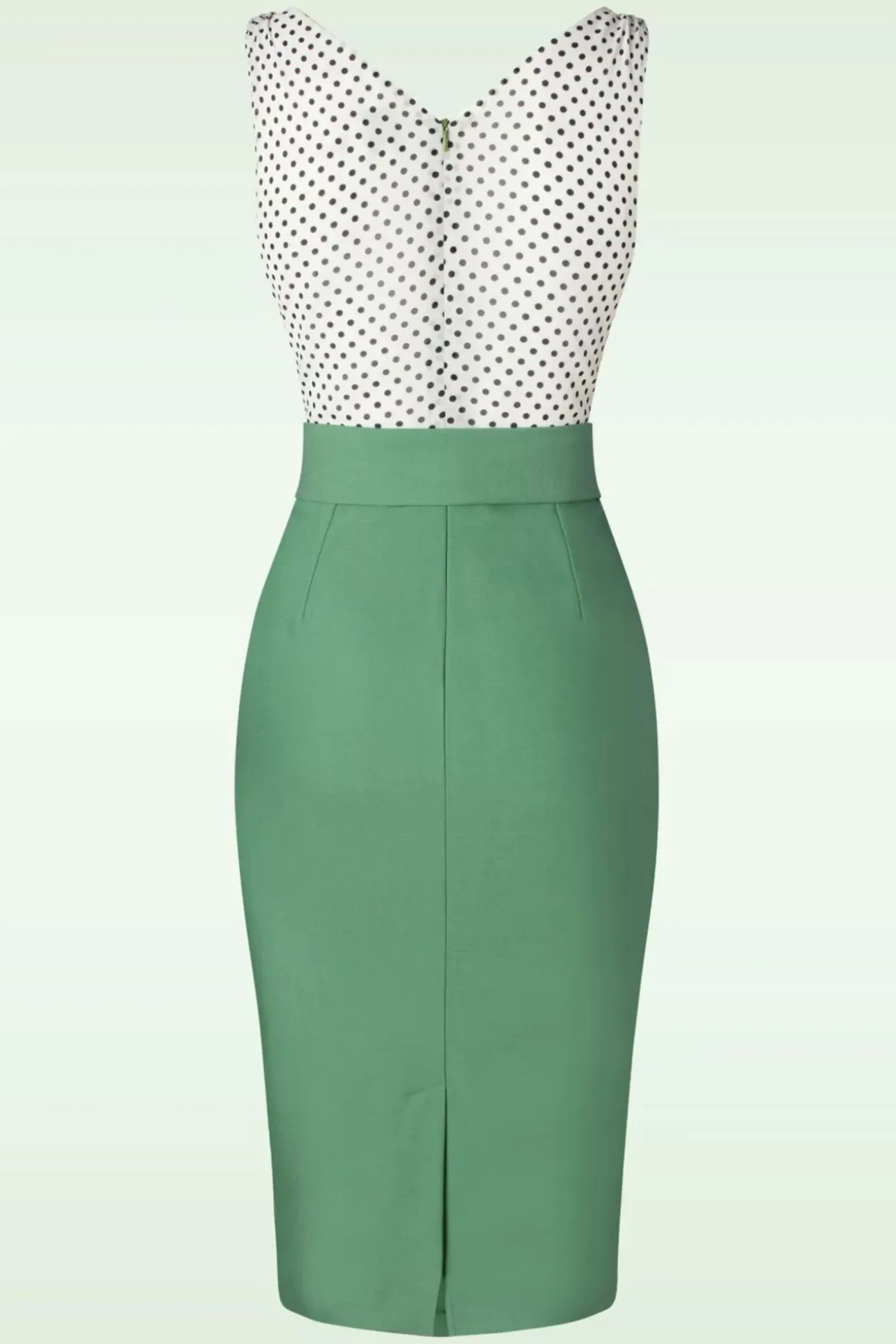 ”This Dress Is Pure Dopamine And It’s Dopa-Mine!” De Witte Top Van Deze Body Hugging Pencil Dress Is Bezaaid Met Zwarte Polkadots Terwijl De Rok Is Uitgevoerd In Een Stevige, Maar Luchtige Saliegroene Stof (Stretcht Amper!) Met De Look Van Linnen. ”Not ‘Just’ A Dress, But Instant Happiness!” 😉