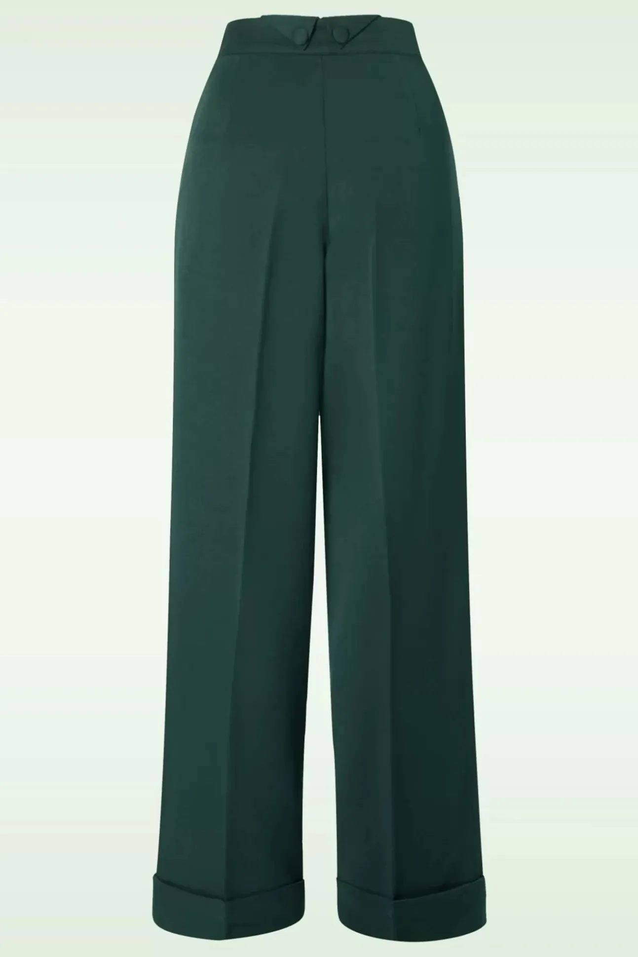 De 40S Hidden Away Trousers In Teal Is Geïnspireerd Op De Pantalons Die De Vooruitstrevende Dames In De Jaren 40-50 Droegen! De Vrouwelijke Hoge Taille Vormt Een Mooi Contrast Met De Wijde Pijp En Heeft Een Super Afkledend Effect, Ook Als Je Vollere Heupen/Billen Hebt. Het Strikje En Knoopdetail Aan De Achterzijde Maken Het Geheel Helemaal Af. Uitgevoerd In Een Soepel Vallende, Tealgroene Stof Met Een Lichte Stretch En Afgewerkt Met Een Chique Omslagje Bij De Pijpen. Combineer Met Een Blouse En Pumps Voor De Perfecte Zakelijke Look In Retro Stijl!