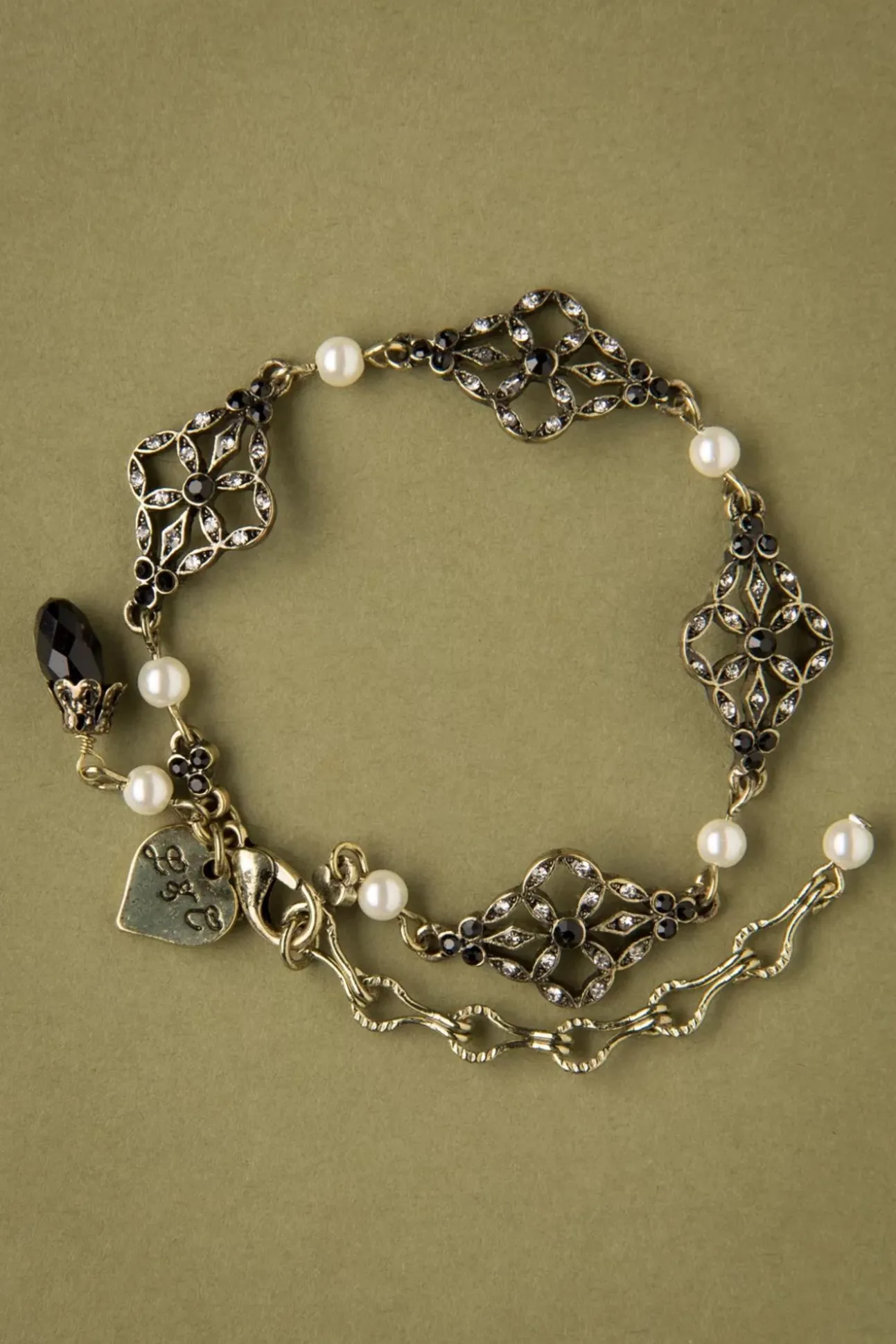 Geef Je Outfit Een Sprankelende Touch Met Deze 20S Victorian Filigree Bracelet In Black Om Je Pols! Deze Prachtige, Handgemaakte Armband Is Geïnspireerd Op Victorian Stijl Sieraden; Delicaat En Goddelijk Met Een Subtiele Goth Twist. Uitgevoerd In Antiek Goudkleurig Metaal, Bezet Met Fonkelende Strass Steentjes En Afgewerkt Met Een Hartje, ‘Faux’ Parels En Een Zwarte Druppelvormige Steen. ”sparkle Brilliantly And Shine Brightly!”