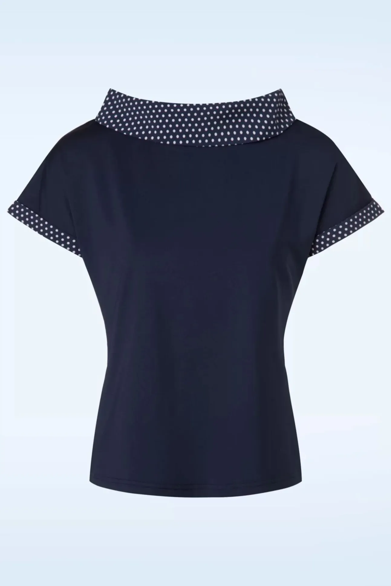 Deze 50S Alicia Blouse Is Een Klassieke Top Met Een Polkadot Twist! Peekaboo Polkadot!… Niet Overheersend Maar Wel Subtiel Aanwezig Op Deze Veelzijdige Top. Ze Heeft Korte Mouwen Met Contrasterende Omslagjes En Een Print Van Witte Polkadots. Een Hoog Gesloten Ronde Halslijn Met Opstaande Omslagkraag Met Diezelfde Schattige Witte Polkadots. Uitgevoerd In Een Zacht, Stretchy, Navyblauw Stofje Voor Een Heerlijk Draagcomfort. Je Kunt Nooit Genoeg Tops Hebben, Maar Deze Zal Met Stip Op Nummer 1 Staan 😉