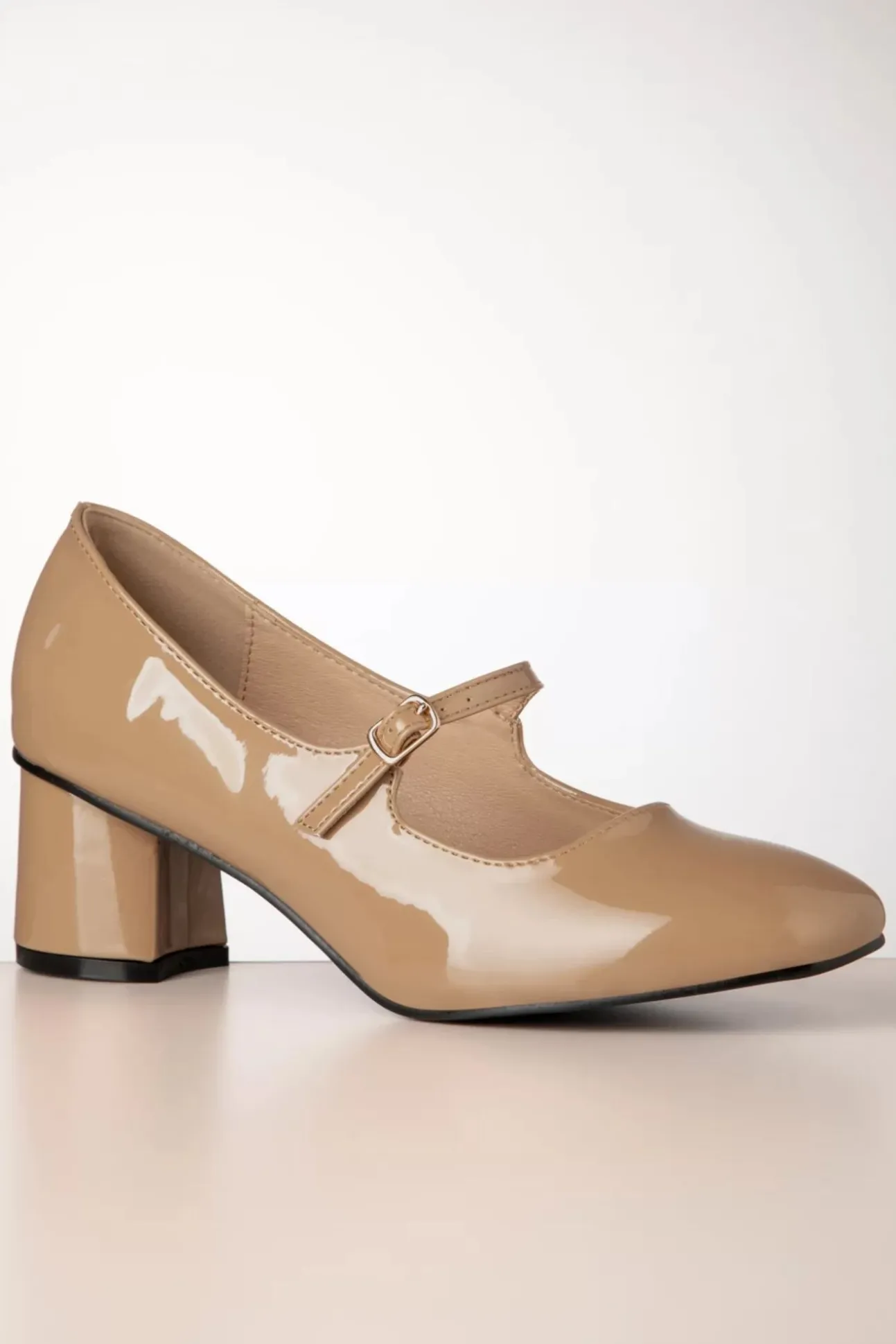 ”Twiggy Just Called; She Wants Her Shoes Back!” Mary Jane Stijl Pumps Uitgevoerd In Latte/Beige Imitatie Lakleder Met Een Verstelbaar Bandje Over De Wreef En Een Sixties Stijl Hakje.