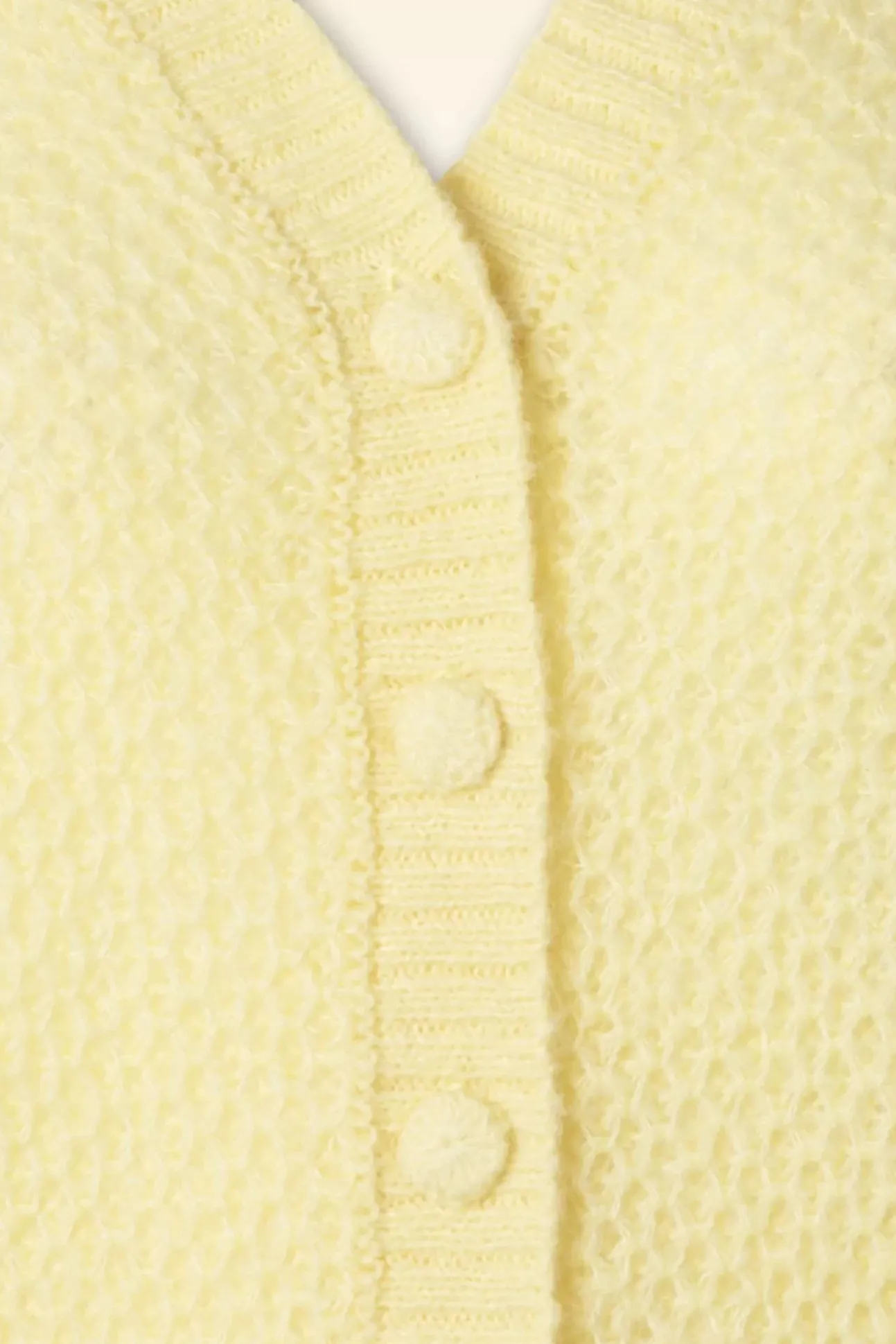 ”Farfalle, You Keep Me Warm!” Dat Doet Ze Natuurlijk Met Haar Luxe, Zachte, Grofgebreide, Custard Gele Acrylmix Die Voorzien Is Van Een Vleugje Wol En Mohair.