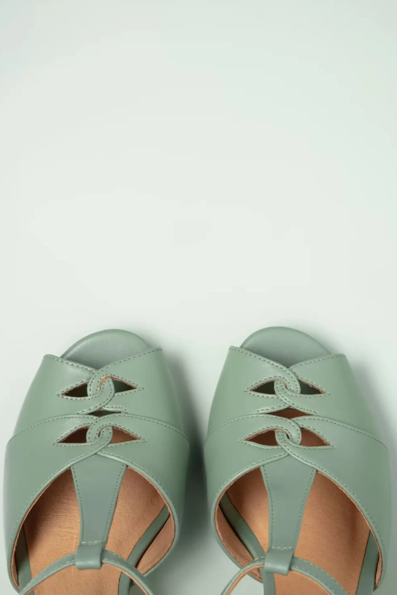 Nieuwe Lente/Zomercollectie ~ Een Perfecte Vintage Inspired Outfit Is Natuurlijk Niet Compleet Zonder De Juiste Pumps! Uitgevoerd In Hoogwaardig Mintgroen ‘Faux’ Leder, Afgewerkt Met Sierlijke Uitsneden, Een T-Strap Bandje, Een Classy Peeptoe En Een Elegante Trechterhak. Dankzij De Zachte Binnenzool Van Leder Is Het Alsof Je Op Wolkjes Loopt! ”Catherina… You’Re Vintage Perfection!”