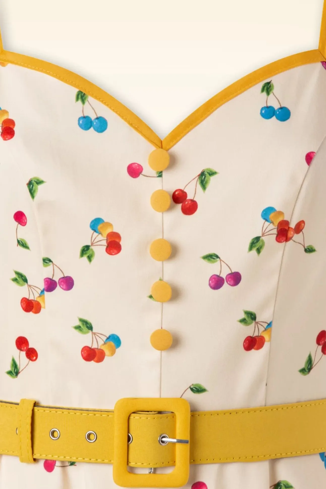 Deze 50S Chacha Cherry Swing Dress In Cream Is Eentje Om Verliefd Op Te Worden! Met Haar Mooie Sweetheart Halslijn, Gele Sierknopen Op Het Lijfje, Korte Opengewerkte Mouwtjes En Kleurrijke Kersenprintje Is Ze Een Echte Eye Catcher. Maar Dat Is Nog Niet Alles… Het Gele Riempje En De Prachtige Semi-Swing Rok Zorgen Ook Nog Eens Voor Een Vrouwelijk En Flirty Silhouet, Oh La La! Uitgevoerd In Een Gladde En Soepele, Crèmekleurige Stof Die Heel Licht Stretcht Voor Een Heerlijke Pasvorm. “Cherry Anyone?”