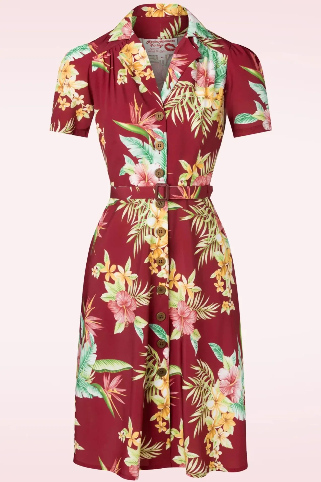 Deze 50S Charlene Honolulu Shirtwaister Dress In Burgundy ‘Will Have You Feeling Fab The Moment You Pop It On’! Deze Beauty Is Zooo Iconisch Vintage Dankzij Haar Elegante Revers Kraagje, Korte Pofmouwen, Reeks Houten Knopen, Afneembare Riem En Flatterend Semi-Swing Stijltje. Uitgevoerd In Een Soepel En Luchtig, Bordeauxrood Stofje (Stretcht Niet!) Versierd Met Kleurrijke Tropische Bloemen, Dat De Look And Feel Heeft Van 1950S Crepe. Of Je Haar Nu Casual Draagt Of Styled Tot Een Full Fifties Look, Charlene Is Altijd De Juiste Keuze!