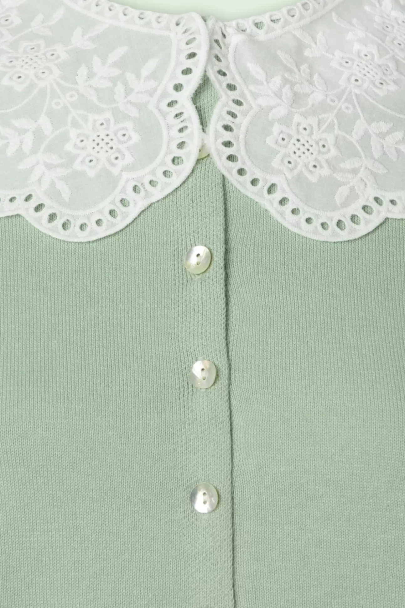 Hey Cutie! Deze Schattige Cardigan Is Uitgevoerd In Pastelgroen Katoen En Is Voorzien Van Een Contrasterende Broderie Kraag. Zie Jij Alle Fantastische Combi’s Al Voor Je?