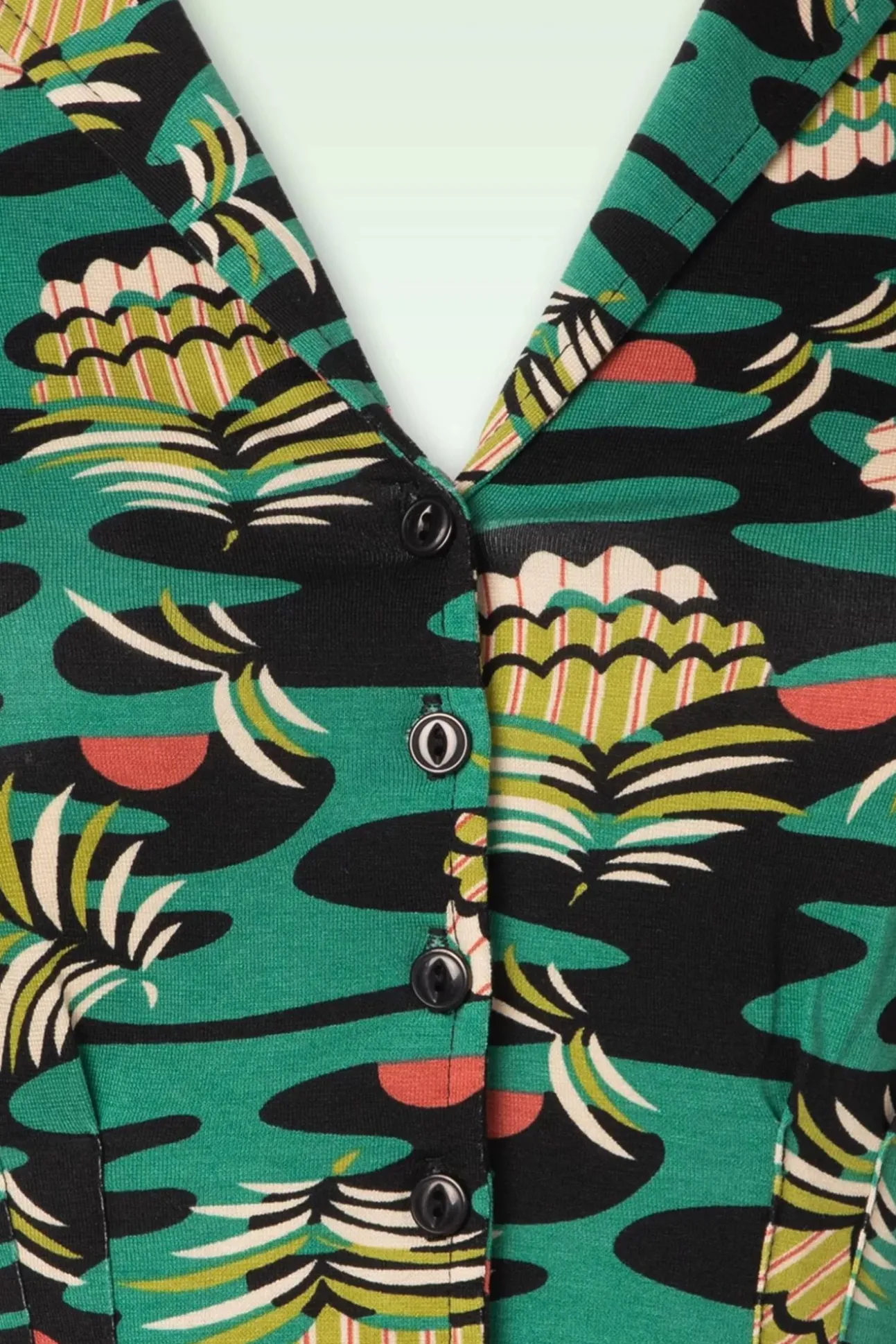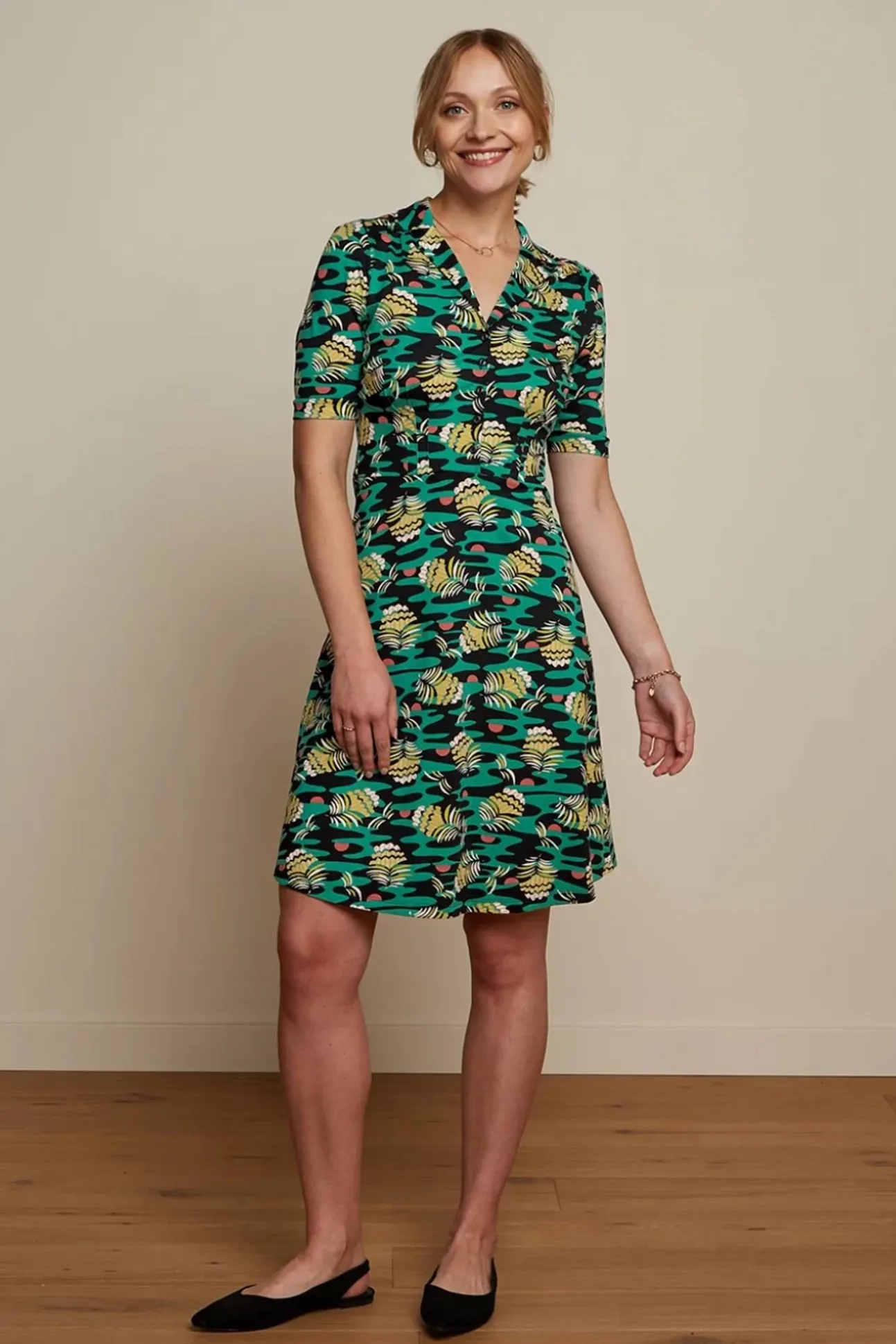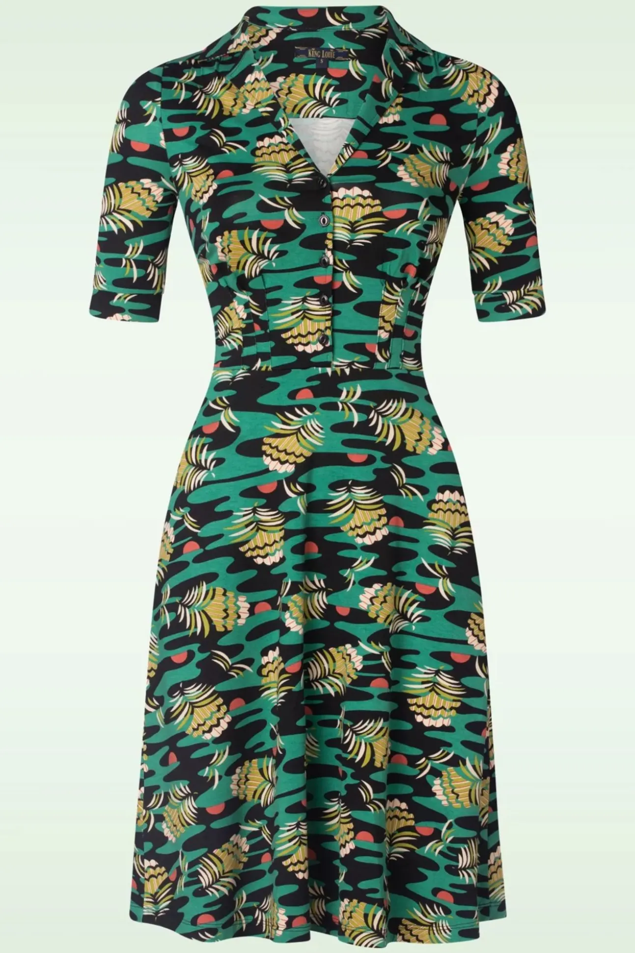 Opzoek Naar Een Speels Jurkje In Sixties Stijl Dat Net Even Anders Is Dan Alleanderen? Dan Is Deze Diner Pica Dress In Black Echt Iets Voor Jou! Met Een Echt American Diner-Model, Korte Mouwtjes En Reverskraagje Ademt Dezejurk Één En Al Vintage! Niet Alleen Het A-Lijntje Is Super Flatterend, Maar Deplooitjes In De Taille Richting De Borst Zorgen Ook Voor Een Mooi Slanksilhouet. Uitgevoerd In Een Zachte En Soepele, Stretchy, Zwart Met Groene Ecovero Viscosemix Voorzien Van Een Kleurrijke Zomerse Print. Deze Hoort Tochgewoon In Jouw Garderobe Thuis?
