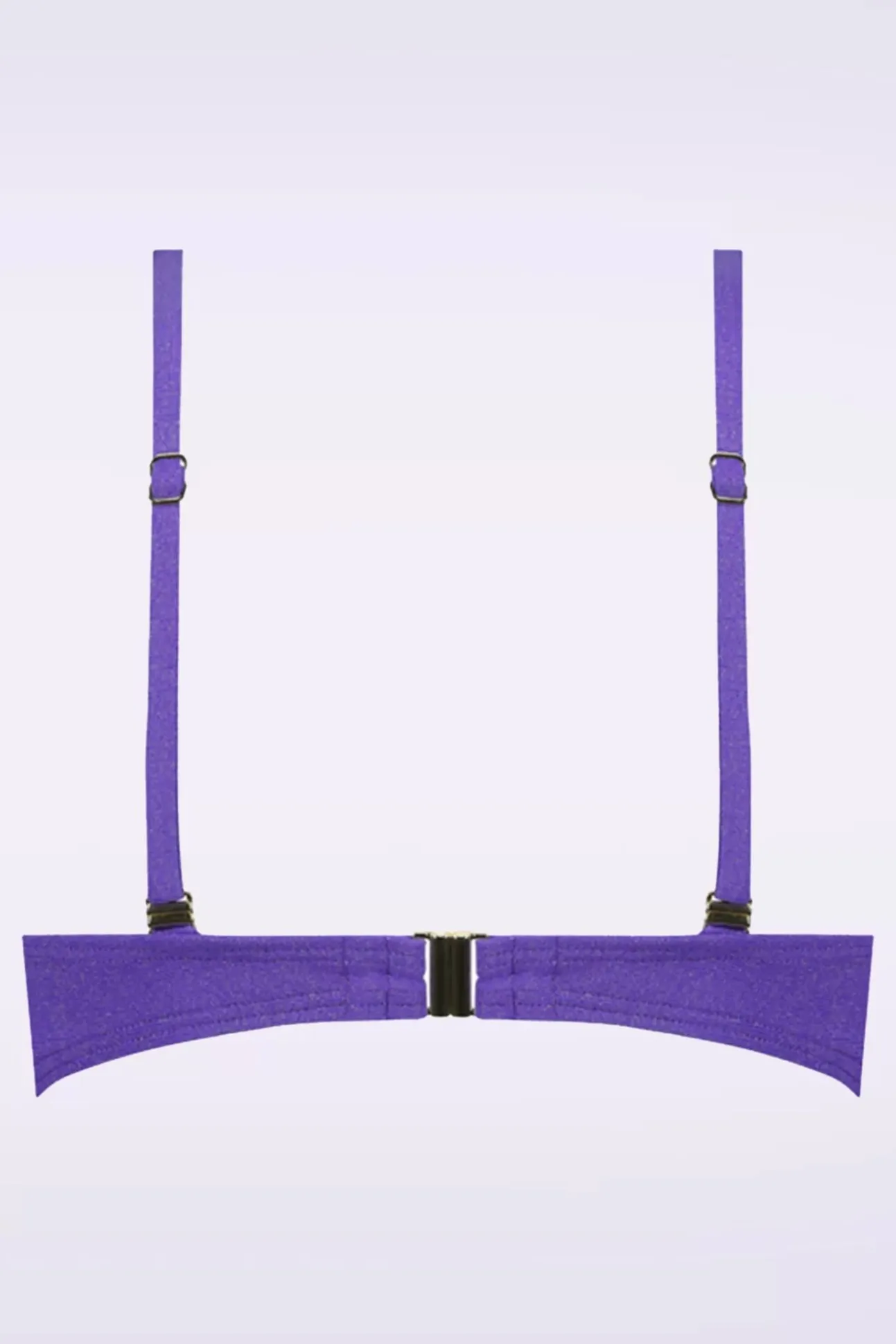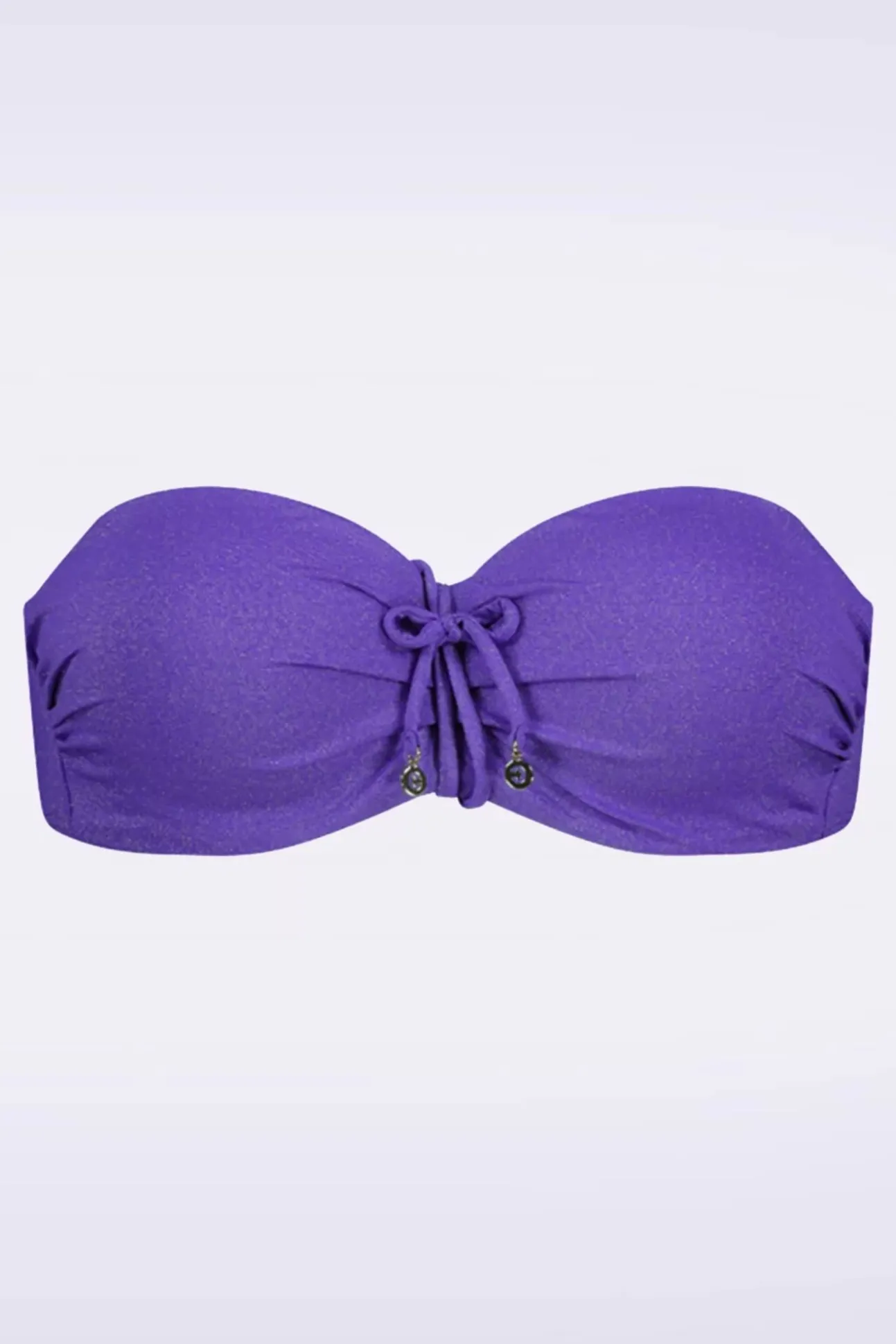 Nieuwe Lente/Zomercollectie ~ Het Strand Is Je Persoonlijke Catwalk Als Je Deze Bikini Top Draagt! Voorzien Van Een Beugel En Padded Cups Die Zorgen Voor Steun En Je Voorzien Van Een Prachtig Decolleté. Je Kunt Deze Top Op Meerdere Manieren Dragen; Met Schouderbandjes, Strapless Of Als Halter. Afgewerkt Met Plooitjes En Een Vast Strikdetail Tussen De Cups. Uitgevoerd In Een Comfy, Perfect Aansluitend Paars Stofje Met Een Goudkleurige Glitter Voor Een Beetje Glamour In The Sun. ”Too Glam To Give A Damn!”