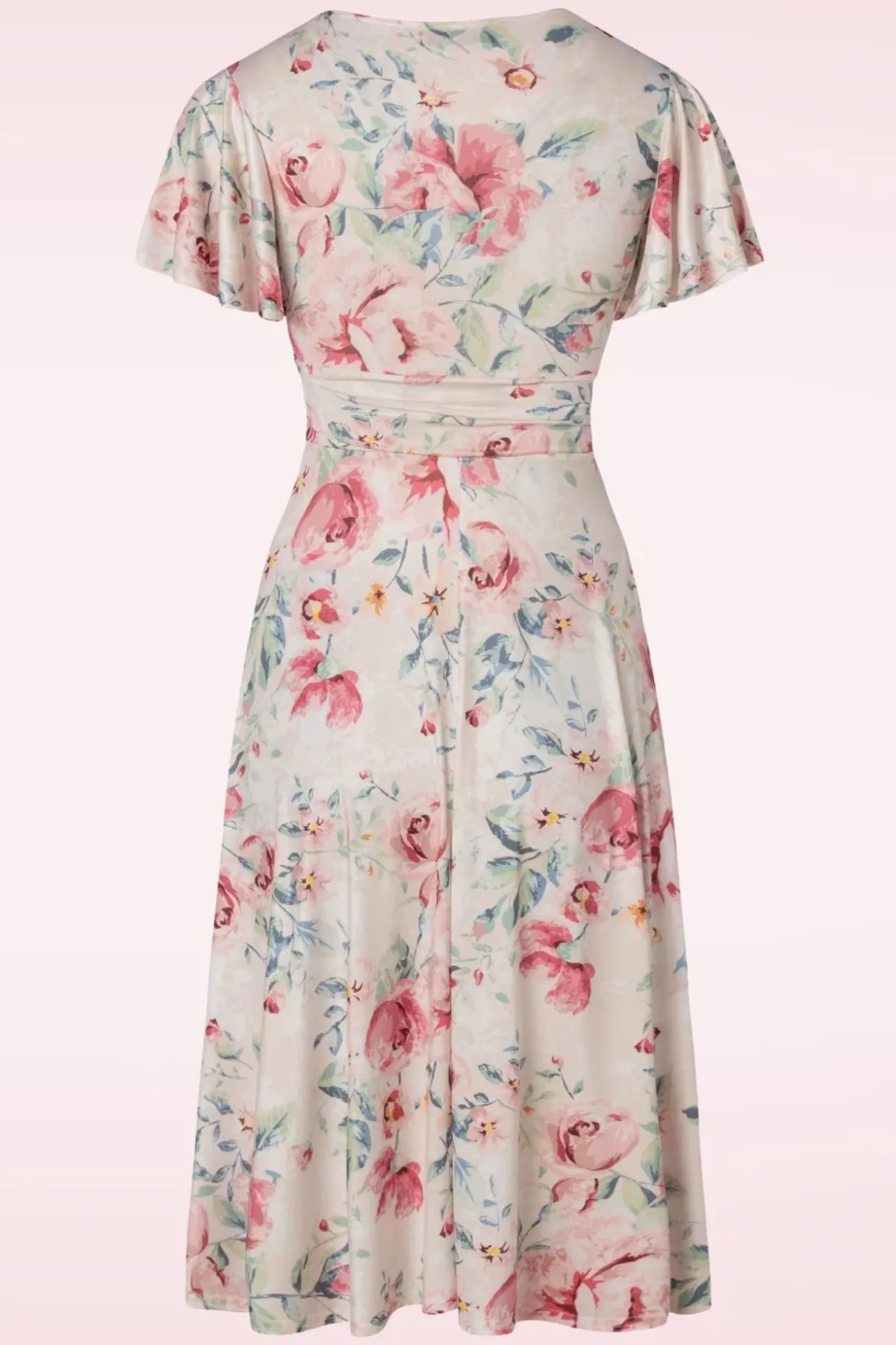 Hoe Mooi Is Deze 40S Irene Flower Cross Over Swing Dress In Silky Cream?! Ze Laat Je Op En Top Vrouw Voelen Door De Prachtige Aansluitende Overslag Top Met Een Sexy V-Halslijn, Speelse Strikbandjes Die Je Zowel Los Als Gestrikt Kunt Dragen En Haar Flatterende Plooien In De Taille. De Zwierige Vlindermouwtjes Geven Haar Een Flirty Touch Terwijl De Flatterende Semi-Swing Rok Zorgt Voor Een Flinke Portie Elegantie, Wow! Ze Is Uitgevoerd In Een Glad En Soepel, Licht Glanzend, Crèmekleurig, Stretchy Stofje Bezaaid Met Prachtige Roze Rozen, Dat Garant Staat Voor Veel Kreukvrij Draagplezier. Irene Is Liefde, Pure Jurken-Liefde!