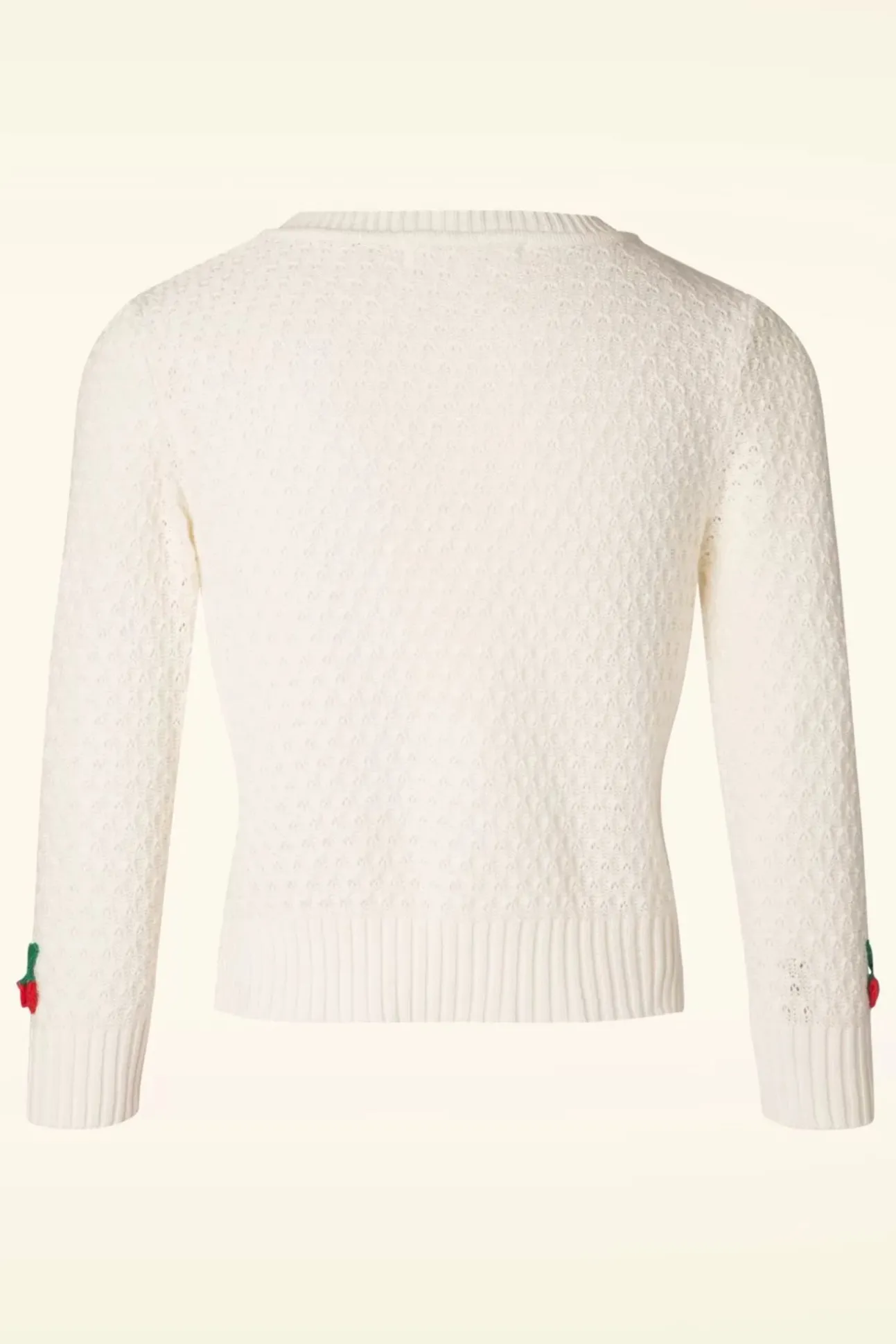 Deze 50S Jennie Cherry Cardigan In Ivory Is Te Leuk En Online In Nederland, Duitsland En Frankrijk Exclusief Verkrijgbaar Bij Topvintage! Vestjes Zijn Vaak Ondergewaardeerde Kledingstukken Maar Laten We Daar Eens Verandering In Brengen! Je Draagt Ze Open Of Gesloten En Zorgen Ervoor Dat Je De Rest Van Je Garderobe Ook Tijdens Koudere Dagen Kunt Dragen, Daar Verdienen Ze Toch Wel Wat Credits Voor?! Deze Retro Topper Heeft Een Klassieke Snit Met Een Ronde Halslijn, 3/4 Mouwen En Schattige Applicaties Van Rode Gehaakte Kersen. Uitgevoerd In Een Dikkere Maar Heerlijke Soepele En Stretchy, Fijn Gebreide Ivoorkleurige Katoen Met Een Subtiel Ruitpatroon. Jennie Verdient Echt Een Plaatsje In Jouw Kledingkast, Toch?