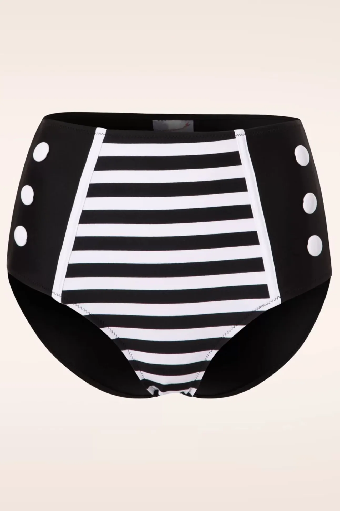 Die Ene Leuke Marinier? Laat Zijn Hart Smelten Met Deze 50S Joelle Stripes Bikini Pants In Black And White! Dit Broekje Met Contrasterende Witte Streepjes En ‘Faux’ Knoopjes Wordt Hoog In De Taille Gedragen Waardoor Jij Een Onweerstaanbaar Vrouwelijk Silhouet Krijgt En Tevens Eventuele Buikprobleempjes Verdoezelt. Uitgevoerd In Een Comfortabel, Stretchy Stofje Dat Heerlijk Draagt En Perfect Aansluit. We Like Sailors… But We Love The Sailor Style!
