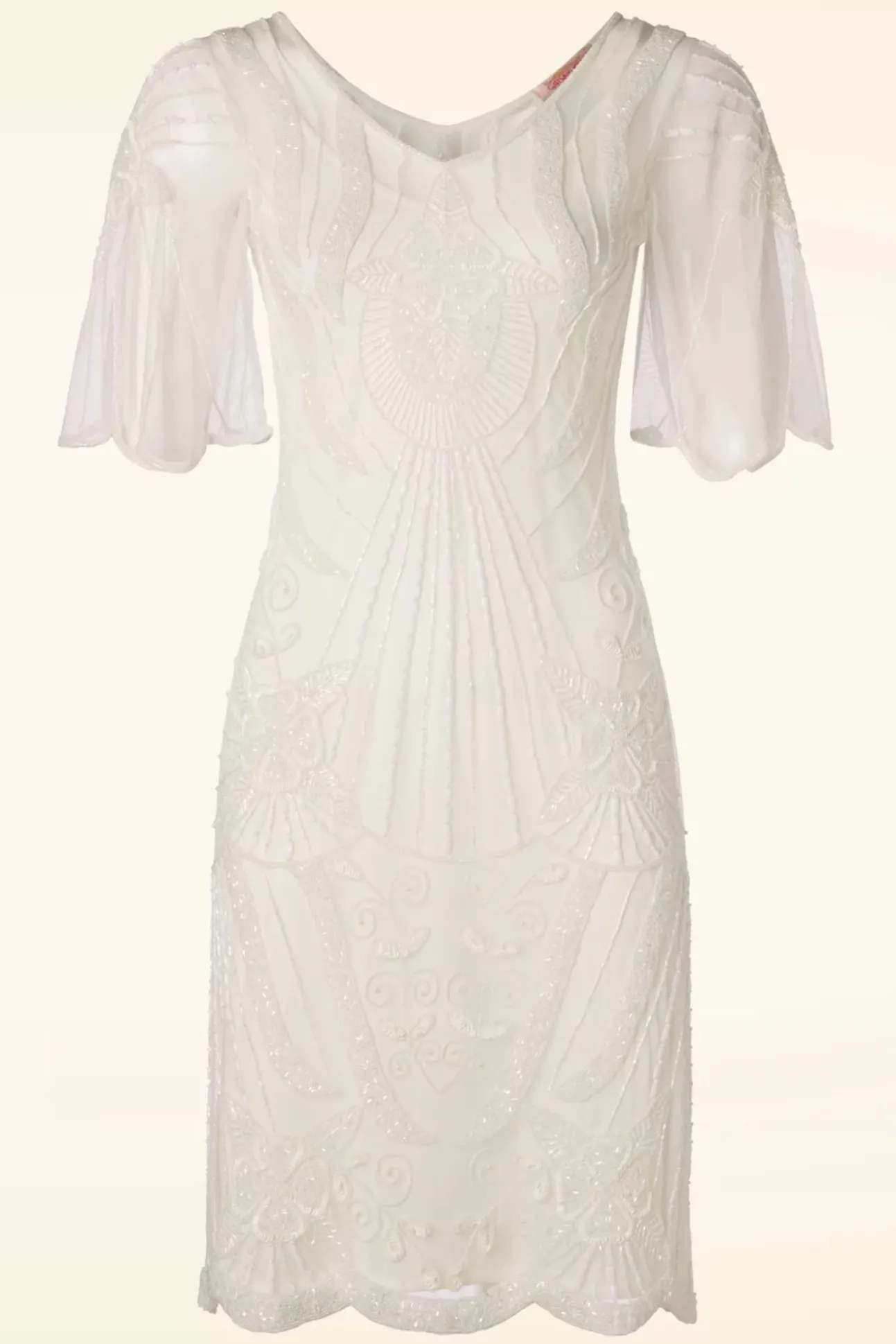 Deze 20S Kate Flapper Dress In Ivory Is Een&Nbsp;Prachtige Met De Hand Bewerkte Reproductie Van De Elegante Flapper Dresses Uit De Jaren 20! Laat Je Meenemen Naar De Lang Vervlogen Romantische En Glamorous Tijden! Deze Showstopper Is Bezaaid Met Minuscule, Glimmende Glaskraaltjes En Crèmekleurige Pailletten Die Er Met De Hand Opgestikt Zijn, Wow! De Top Heeft Een Elegante V-Hals, V-Rug En Prachtige Zwierige, Geschulpte Vlindermouwtjes. Ze Is Uitgevoerd In Een Ivoorkleurig, Semi-Doorschijnend Stofje Met Een Lichte Stretch En Heeft Een Ivoorkleurige Slip Dress Voor Extra Comfort.&Nbsp;Nu Maar Hopen Dat Je Man/Date Net Zo Galant Is Als De Mannen Van Vroeger 😉