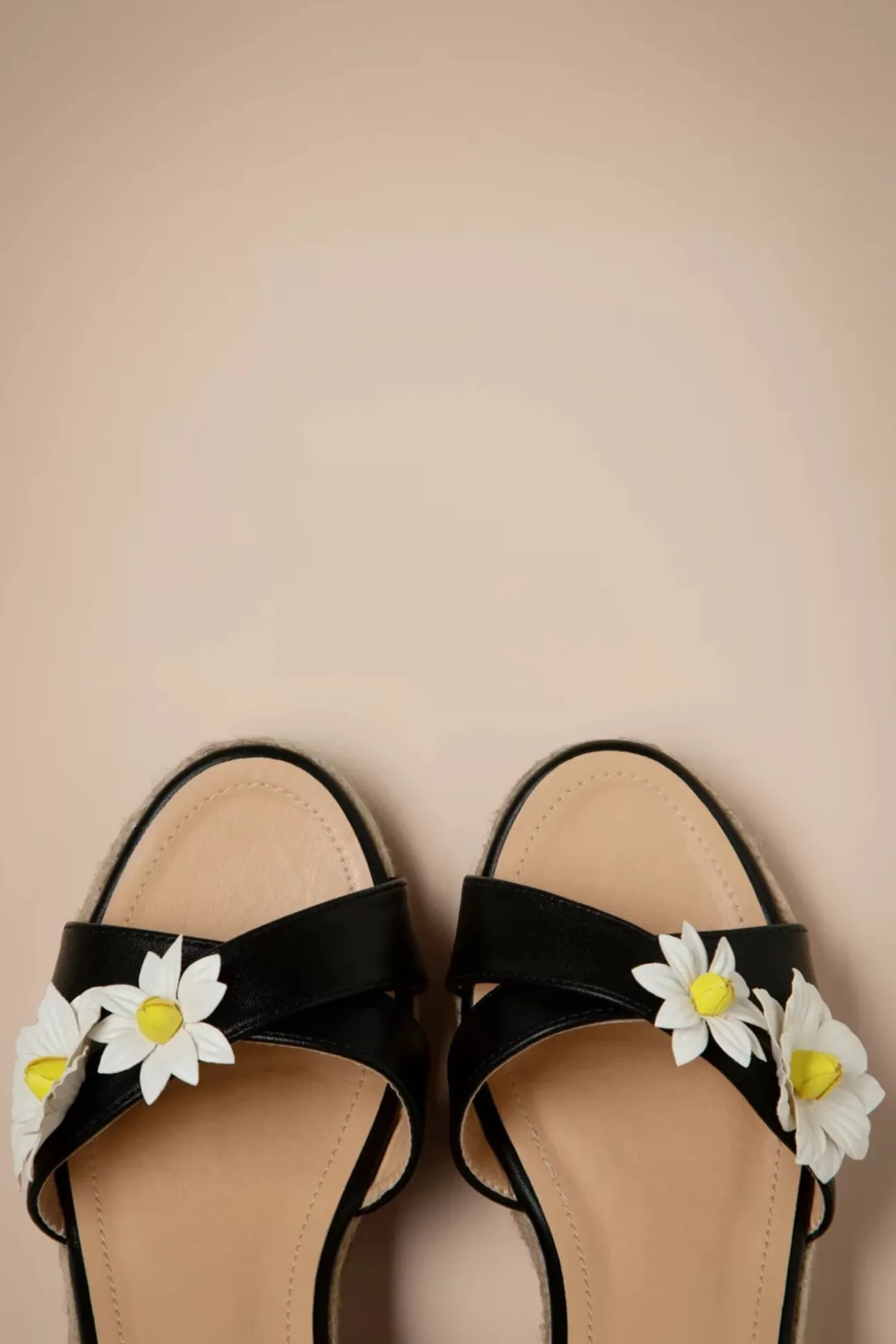 Je Spring Look Naar Een Hoger Niveau Liften Is Een Fluitje Van Een Cent Met Deze Lady Daisy Wedges In Black Aan Je Voetjes! Het Perfecte Alternatief Voor Je High Heels Want Ze Laten Je Benen Langer Lijken Terwijl Ze Heerlijk Comfortabel Zitten! Uitgevoerd In Zwart ‘Faux’ Leder, Voorzien Van Strikbanden Die Je Gracieus Om Je Enkel Kunt Wikkelen, Prachtige Madeliefjes Op De Wreef En Natuurlijk Die Typische Raffia Plateau Zool. ”Oopsie Daisy, Added Them To My Cart Already!” 😉