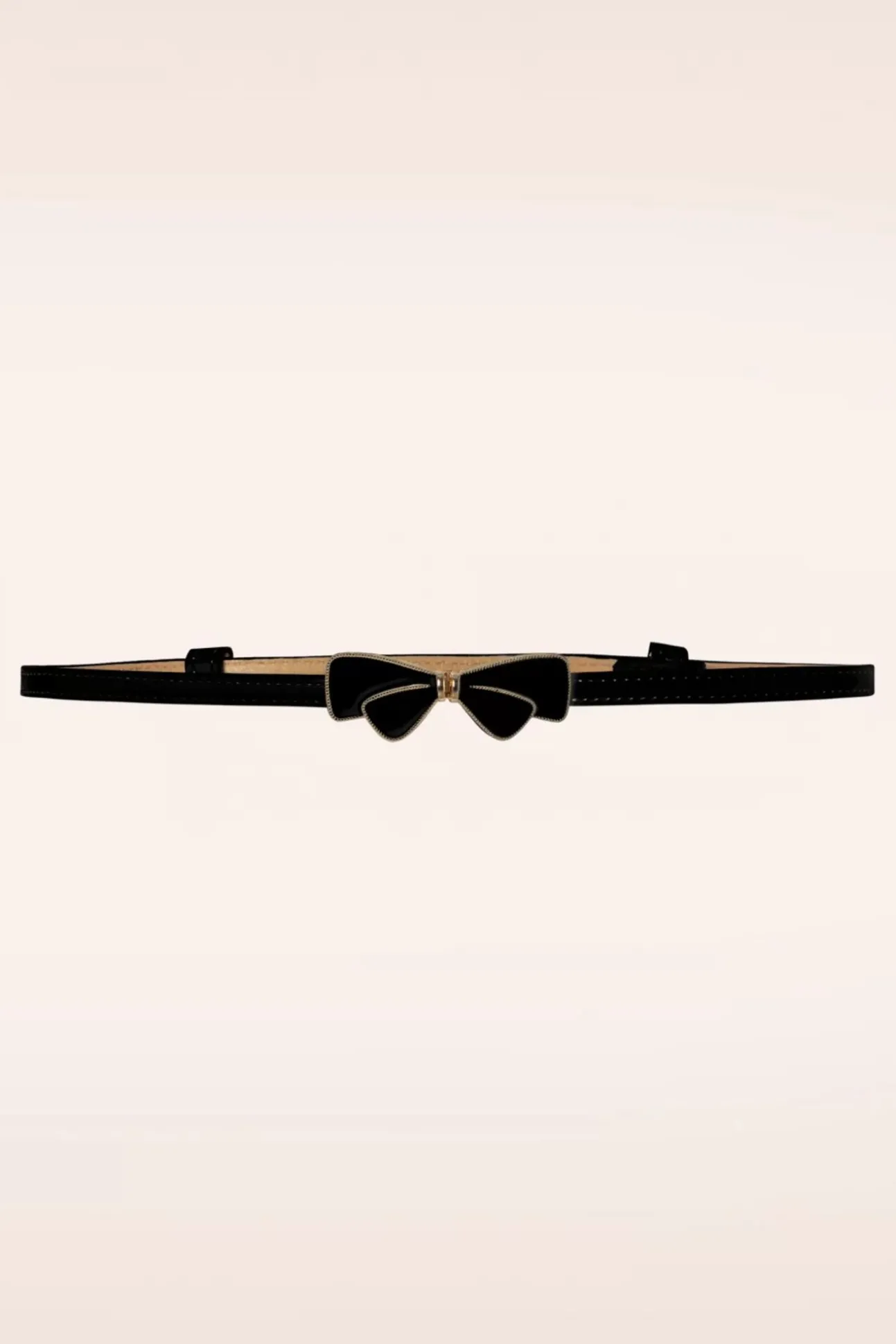 Deze 50S Lana Bow Riem In Zwart Is Een Classy Riempje In Vintage Look En Een Aanvulling Op Elke Outfit. Dit Smalle, Verstelbare Model Is Uitgevoerd In Zwart ‘Faux’ Lakleder En Sluit D.M.V. Een Elegant Goudkleurig Strikje, Très Chique! Een Echte Must-Have Voor Alle Vintage Loving Ladies!
