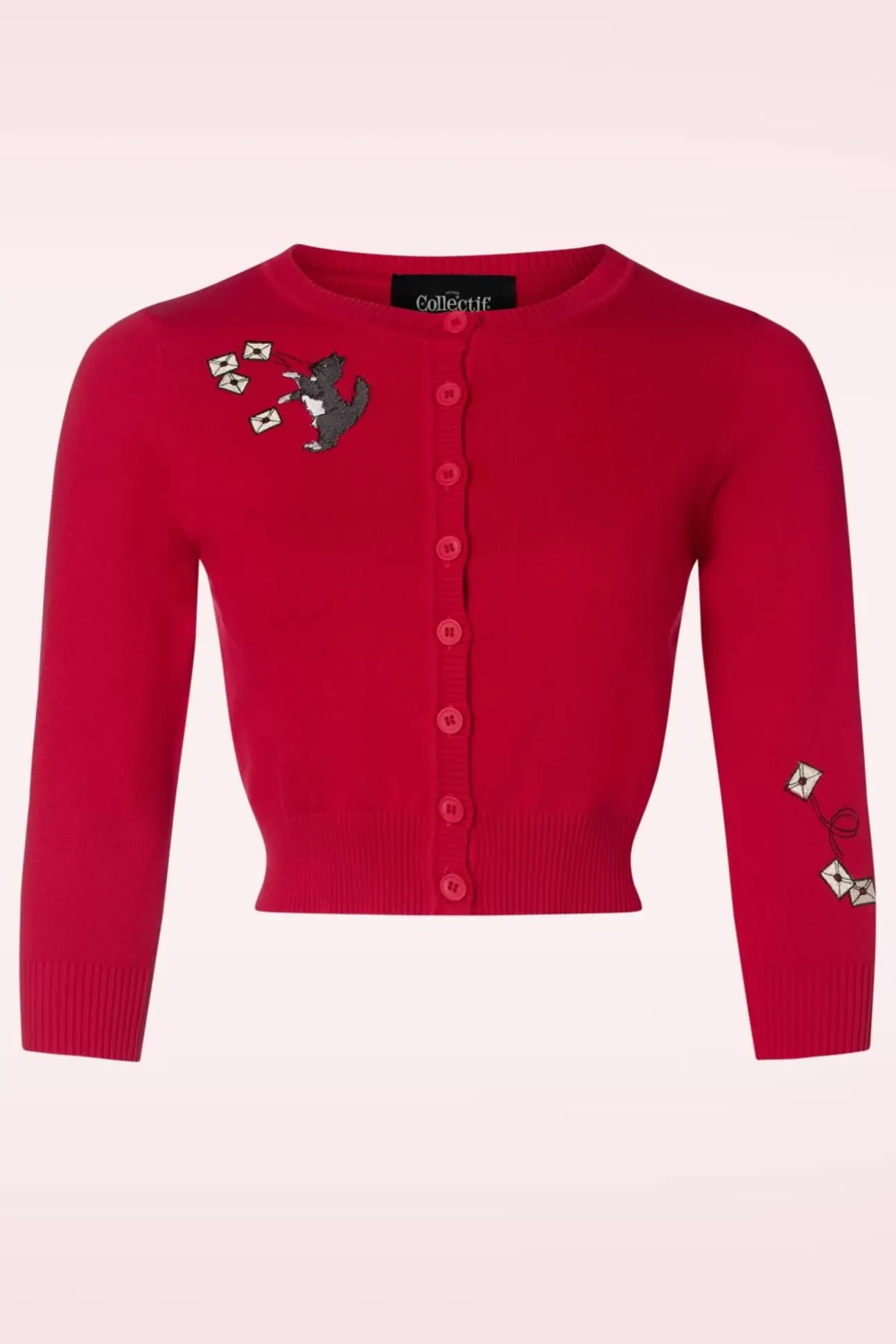 Nieuwe Lente/Zomercollectie ~ De Enige Post Die Wij Willen Ontvangen Is Een Topvintage Pakketje Met Deze Cutie Erin! Ze Is Uitgevoerd In Een Fijngebreide, Dieprode Katoen Die Heerlijk Draagt En Voorzien Is Van Schattige Borduursels Met Een Katje En Enveloppen. Purrrrfect!
