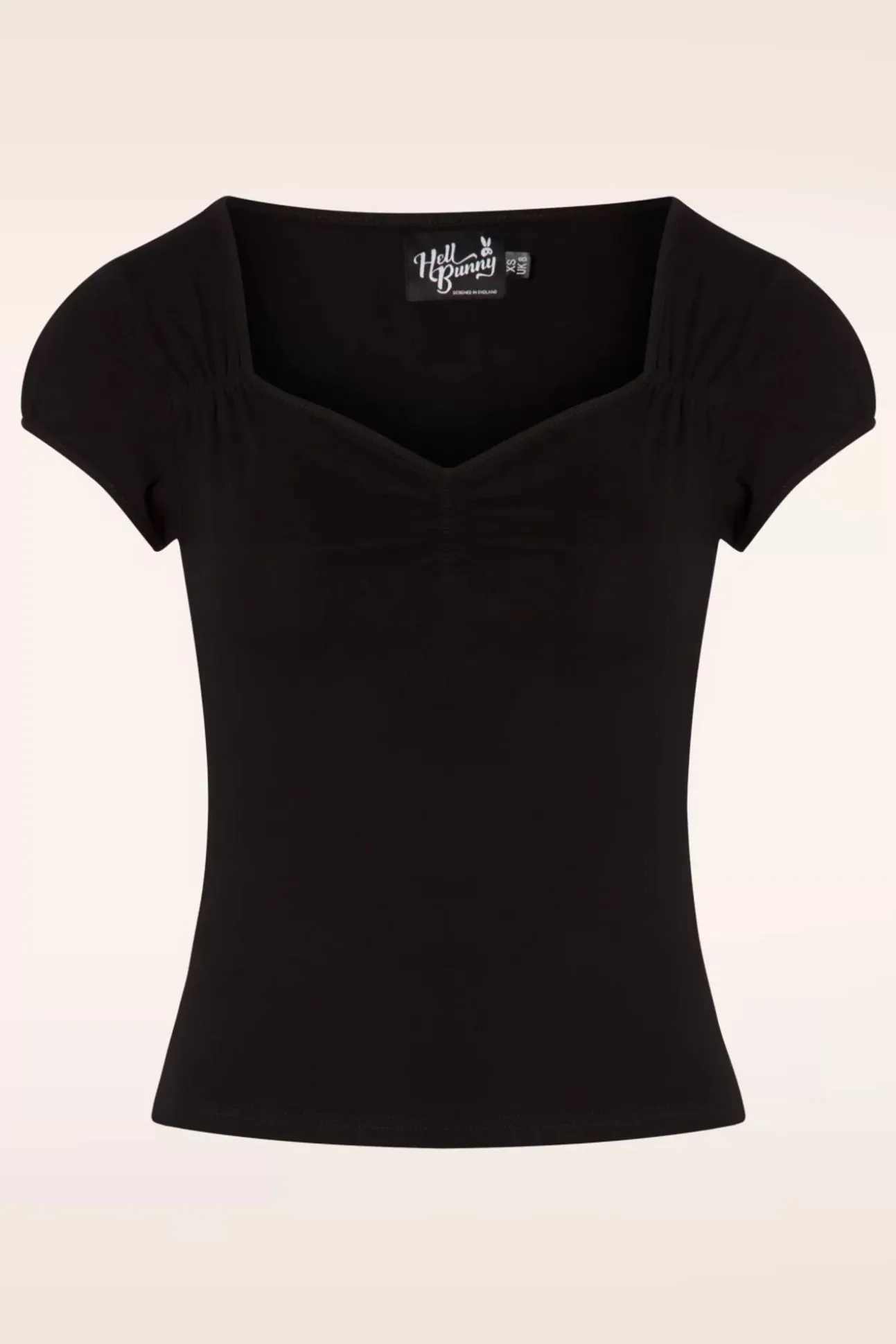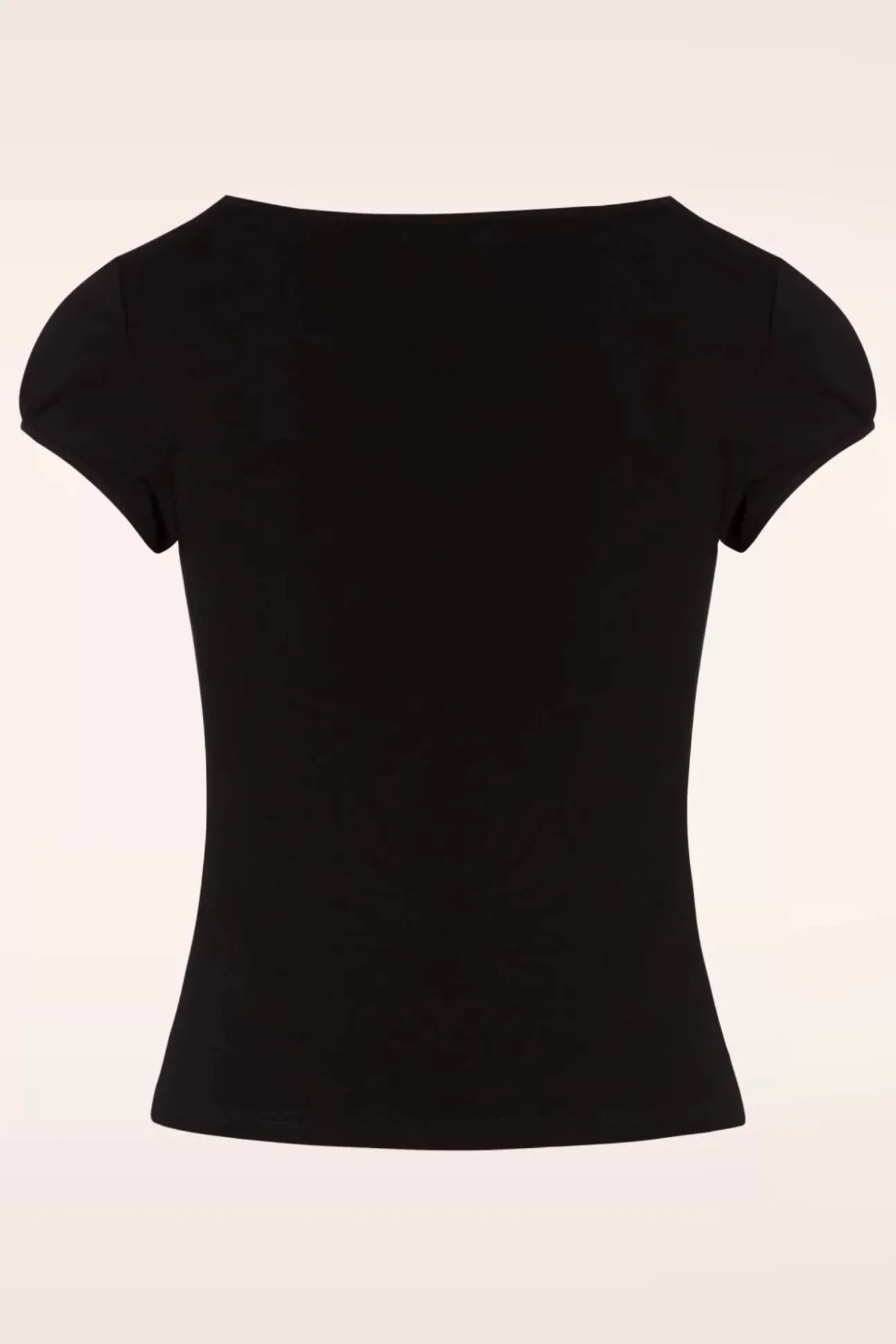 De 50S Mia Top In Black Is Een Veelzijdige Top Inpin-Up Stijl! Ze Heeft Korte Mouwtjes En Een Elegante Diamantvormige Halslijn,Afgewerkt Met Charmante Plooitjes 😉 Uitgevoerd In Een Zachte,Stretchy Zwarte Katoenmix Voor Een Heerlijk Draagcomfort. De Perfecte Top Die Overalmee Gecombineerd Kan Worden!