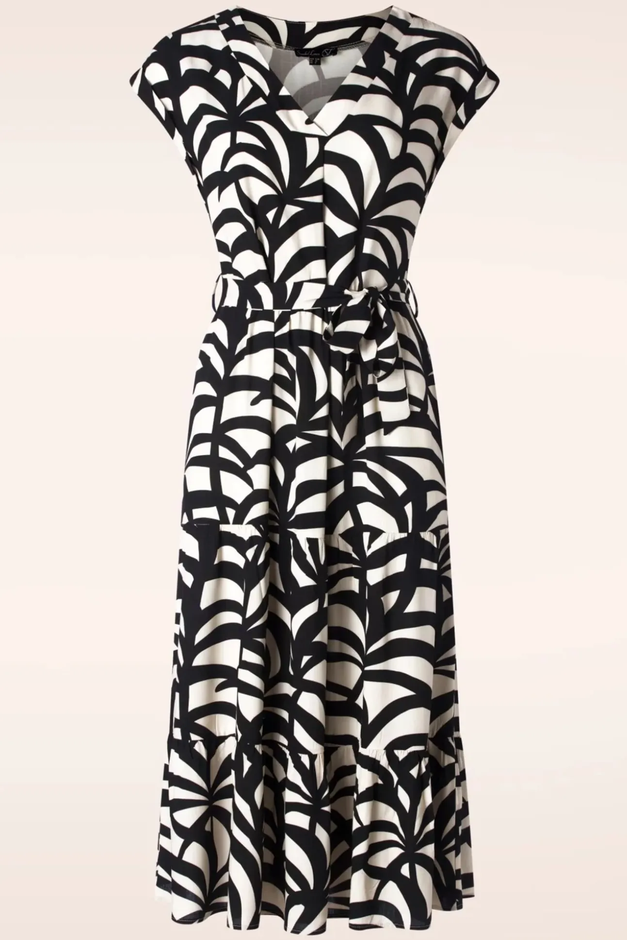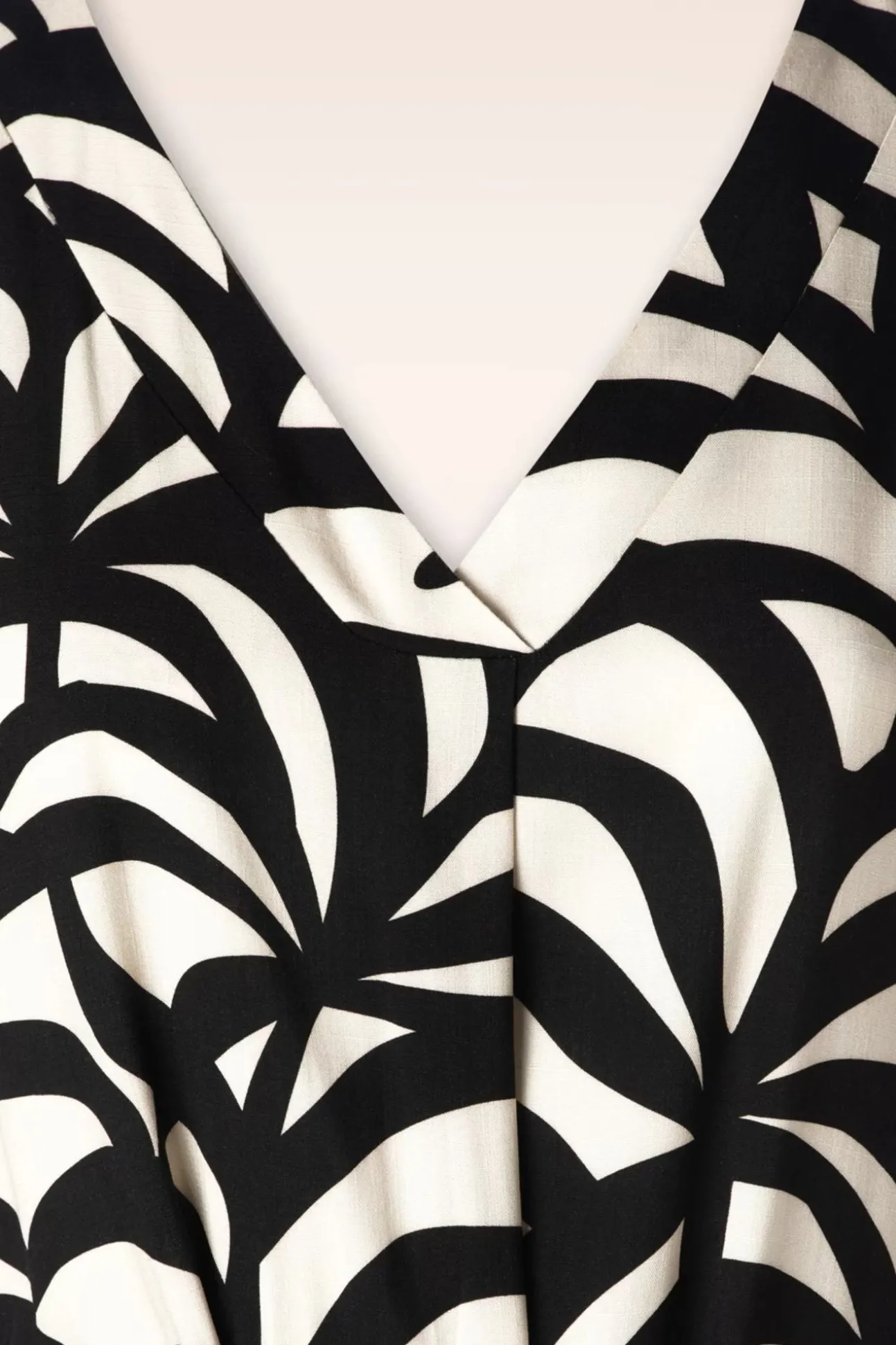 ”Paloma Is A Ticket To The Tropics!” Deze Beauty Is Uitgevoerd In Een Soepele En Luchtige Zandkleurige Stof, Voorzien Van Een Zwarte Grafische Print.