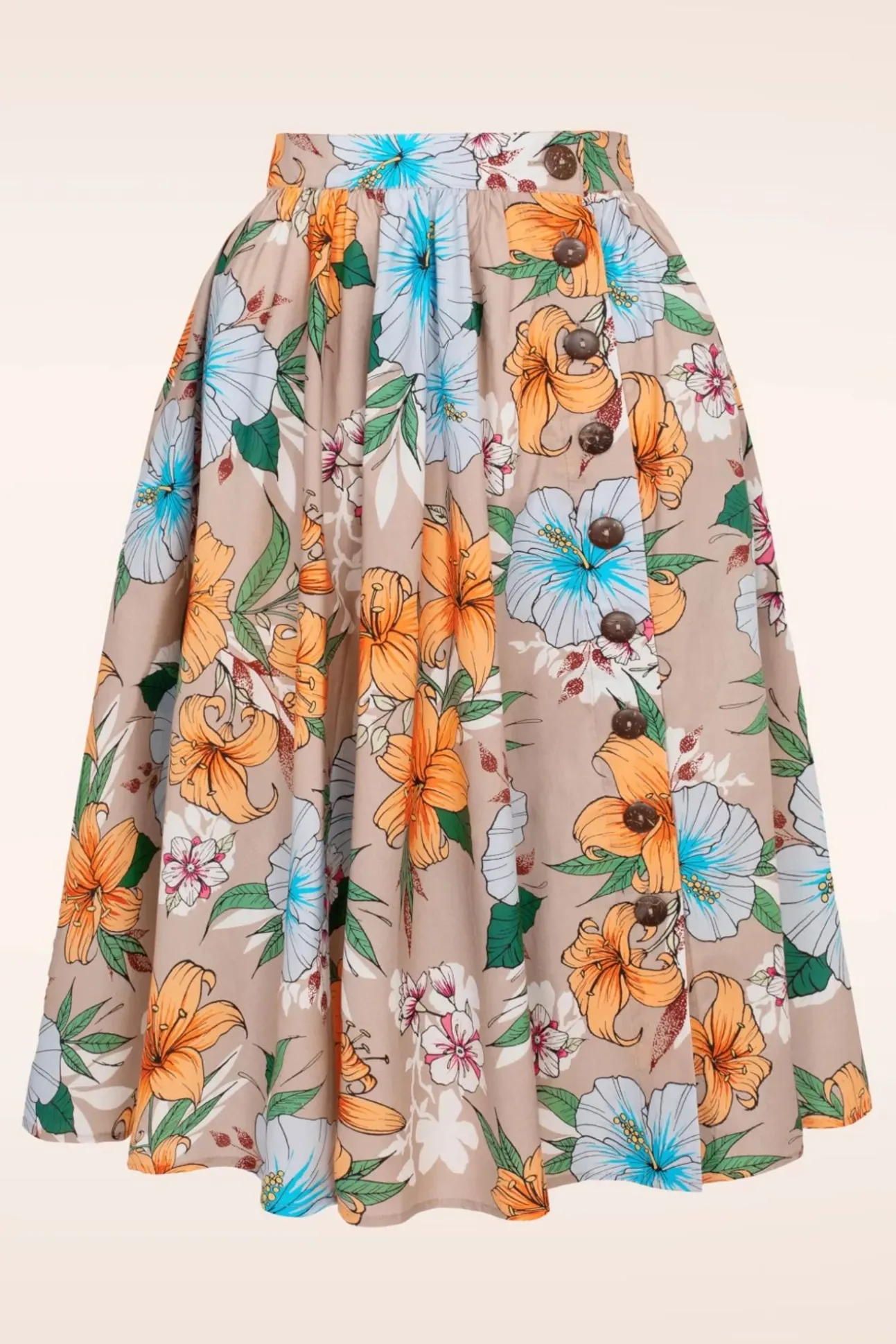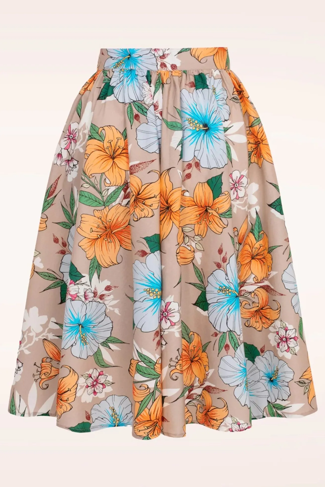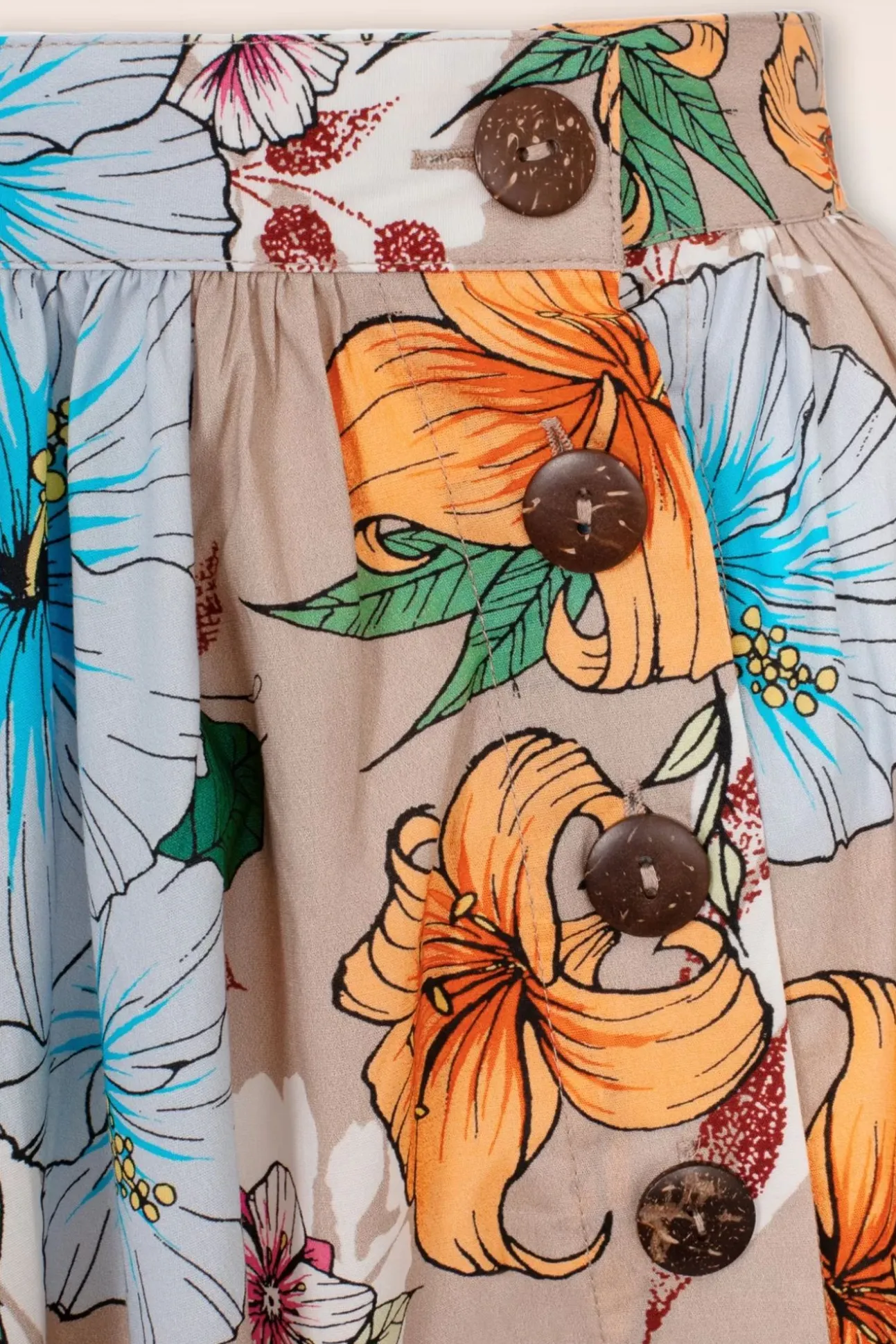 ”Paradise Is Calling!” Deze Rok Is Uitgevoerd In Een Luchtige En Soepele Beige Katoenmix Met Een Lichte Stretch En Voorzien Van Een Tropische Bloemenprint.