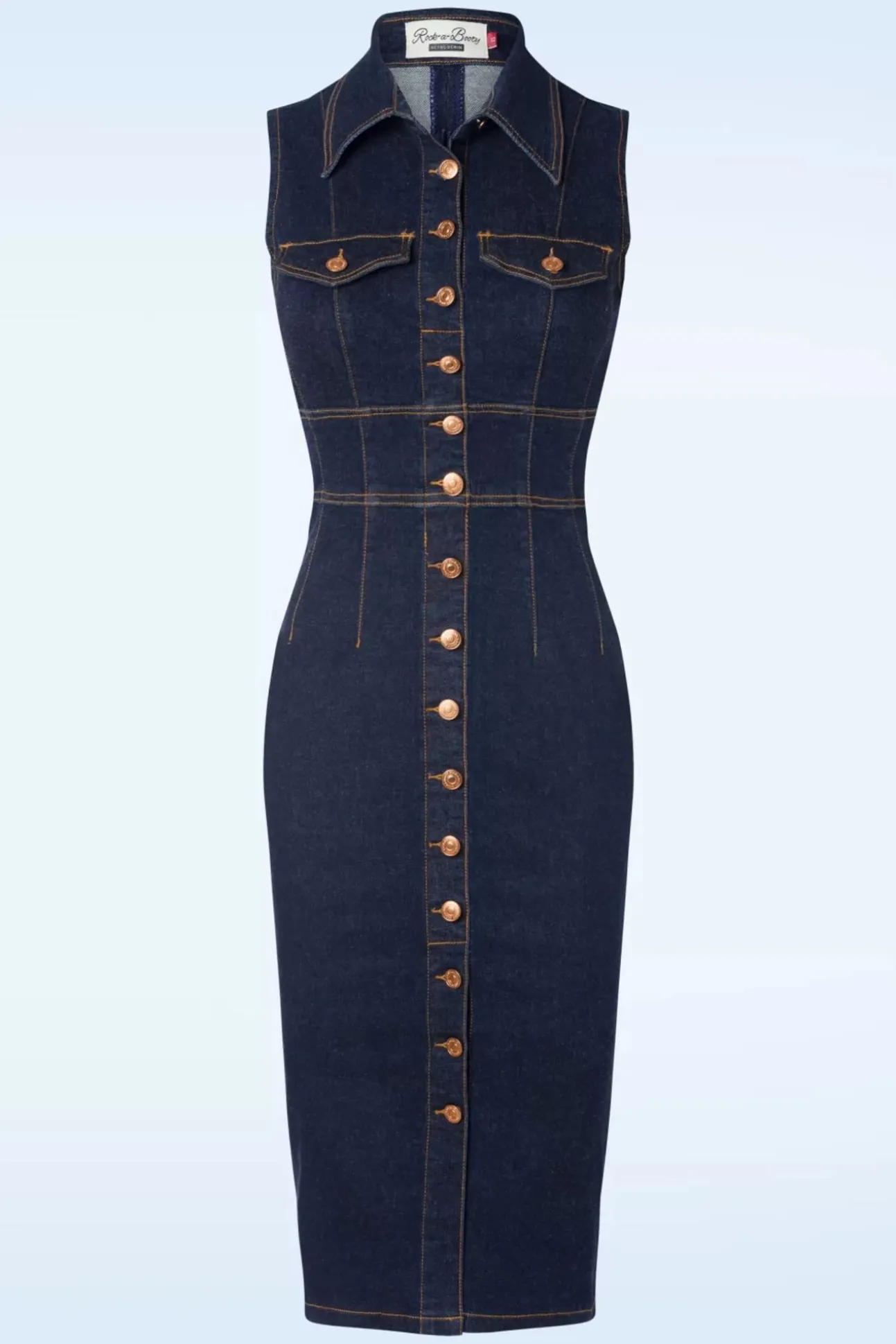 Nieuwe Lente/Zomercollectie ~ ”Denim Blues!” Deze Denim Button Dress Is Klassiek, Tijdloos En Super Vrouwelijk. Ze Wordt Aan De Voorzijde Verfraaid Door Een Rij Koperkleurige (Sier)Knopen, Een Puntig Kraagje, Speelse ‘Faux’ Klepzakjes En Een Sexy Split… Oeh La La! Uitgevoerd In Een Prachtige Stevige, Klassiek Blauwe Katoenmix (Stretchy), Die Je Rondingen Perfect Volgt En Afgewerkt Met Bruine Stiksels Die Voor Een Authentieke Touch Zorgen.