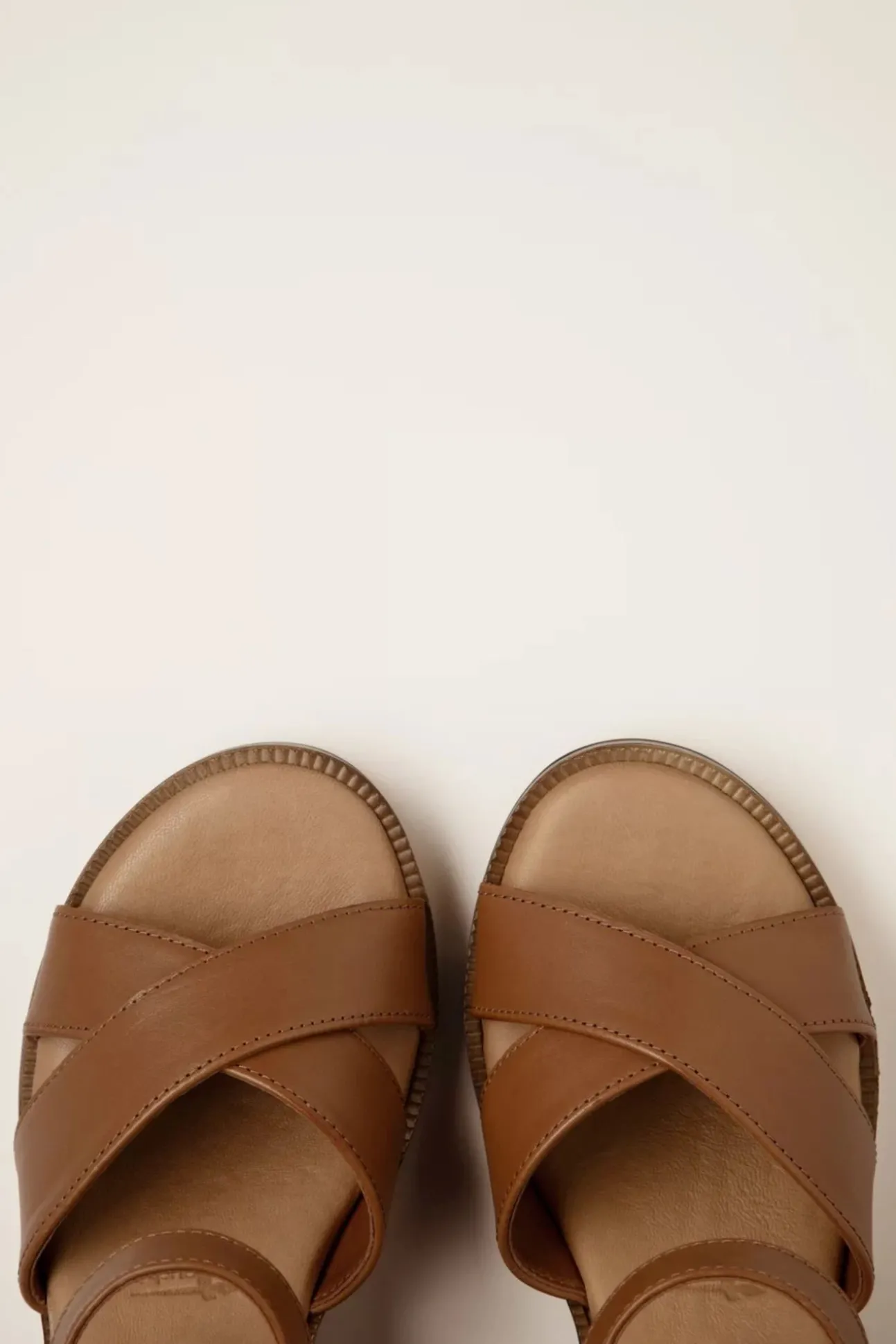 ”Your New ‘sole’ Mates Are Only A Few Clicks Away!” Open Sandaaltjes Uitgevoerd In Hoogwaardig Reebruin Leder Met Gekruiste Bandjes, Een Blokhak En Een Subtiel Plateau In Hout-Look.