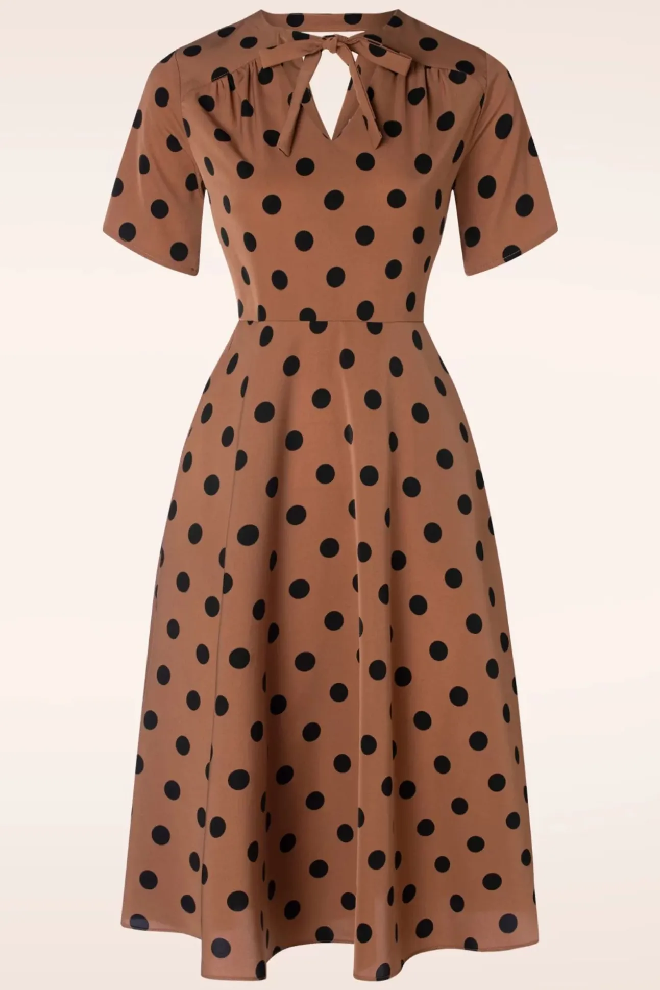 ”Feeling Flirty In Polkadots!” Deze Prachtige Swing Jurk Is Uitgevoerd In Een Bruine, Soepele En Luchtige, Licht Glanzende Stof, Voorzien Van Zwarte Polkadots.